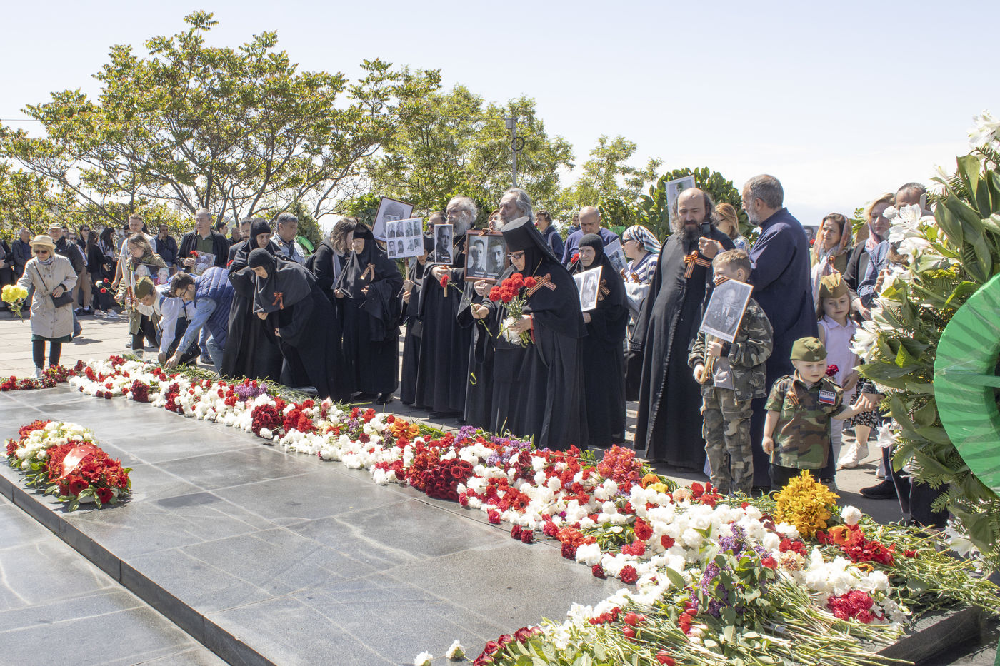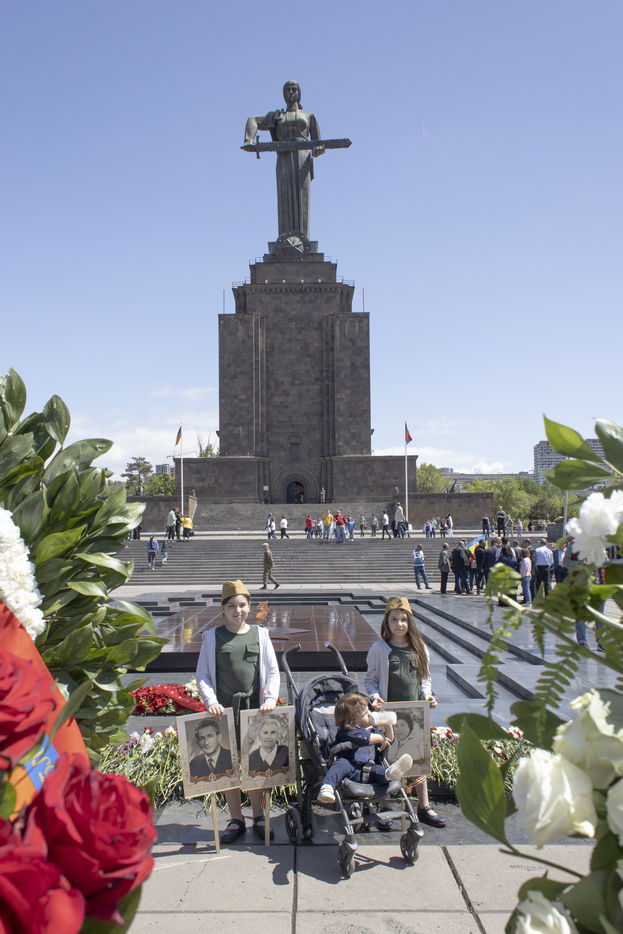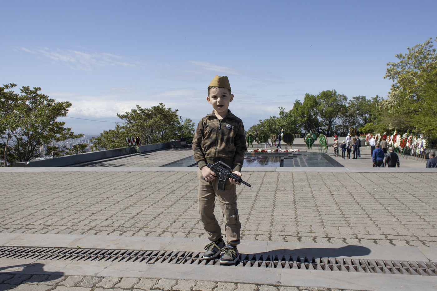 May 9 is a day of celebration marking the end of the Second World War. After the tribute paid by Nicole Pashinyan, President of the Republic of Armenia, accompanied by many delegations, Armenians were able to lay a wreath near the flame of remembrance. Children were able to play war games on the military remains around the large statue of Mother Armenia located in the Victory Park. Yerevan, May 9, 2022.