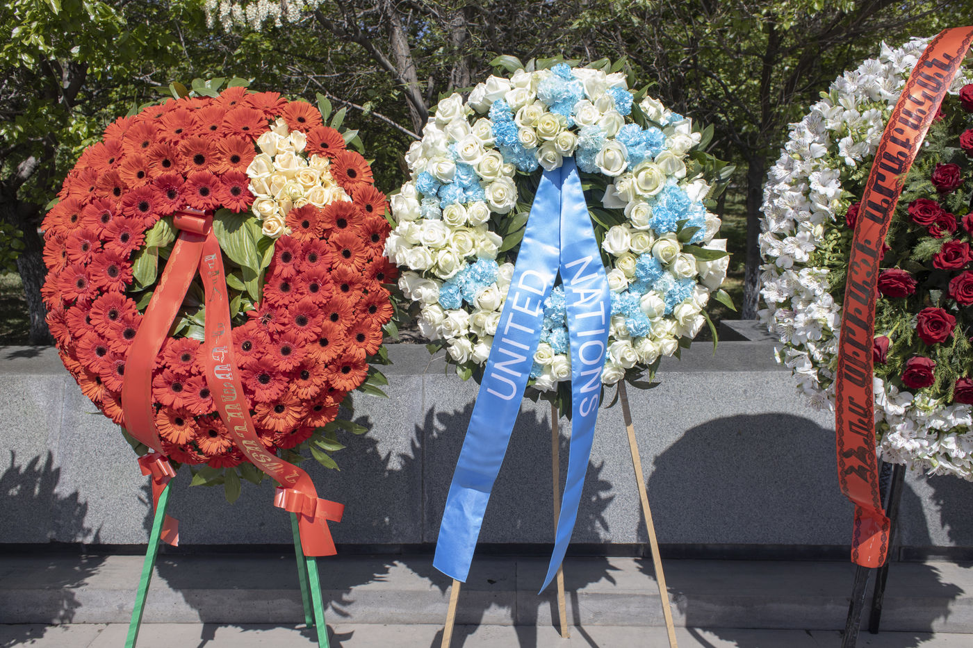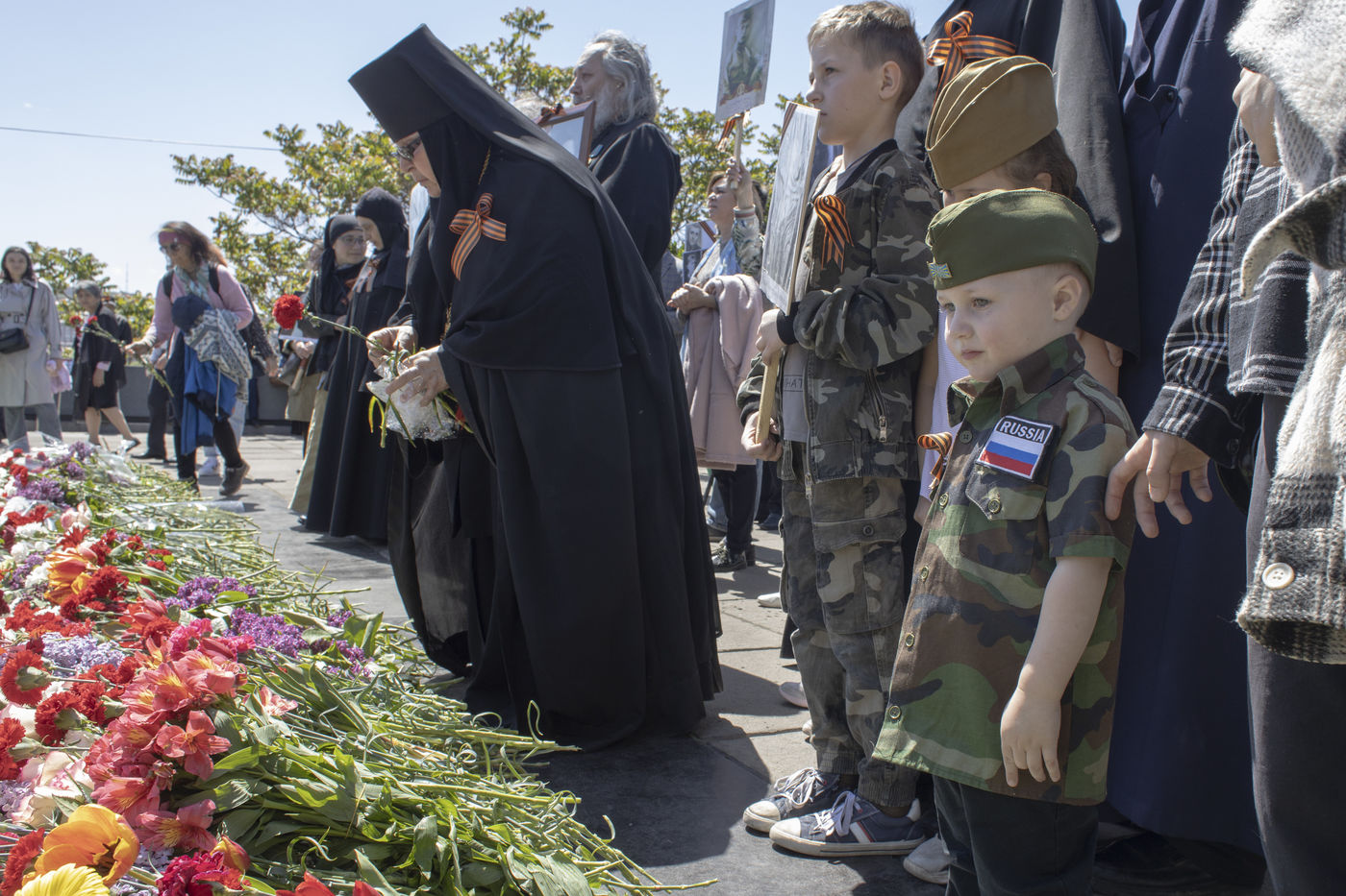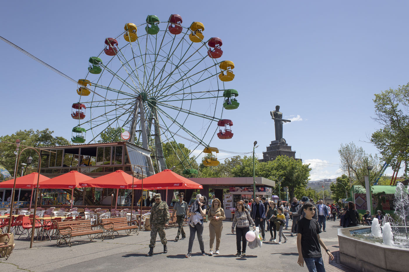 May 9 is a day of celebration marking the end of the Second World War. After the tribute paid by Nicole Pashinyan, President of the Republic of Armenia, accompanied by many delegations, Armenians were able to lay a wreath near the flame of remembrance. Children were able to play war games on the military remains around the large statue of Mother Armenia located in the Victory Park. Yerevan, May 9, 2022.