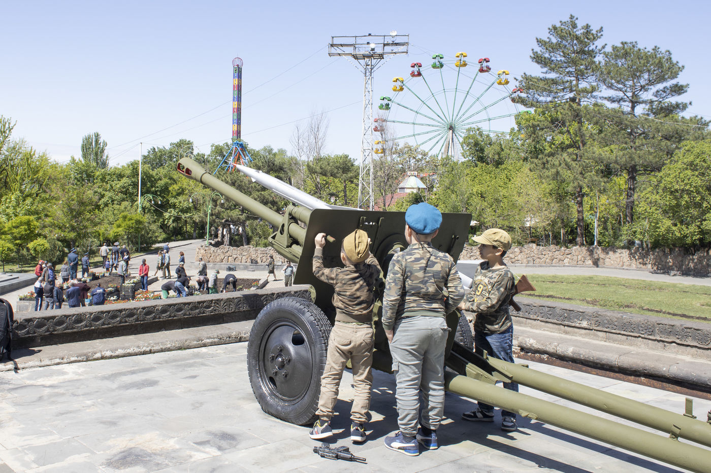 Le 9 mai est un jour de célébration qui marque la fin de la seconde guerre mondiale. Après l'hommage rendu par Nicole Pashinyan, président de la République d'Arménie, accompagné de nombreuses délégations, les Arméniens ont pu deposer une gerbe de fleur près de la flamme du souvenir. Les enfants ont pu jouer à la guerre sur les vestiges militaires autour de la grande statue Mère Arménie située dans le parc de la Victoire. Yerevan, le 9 mai 2022.