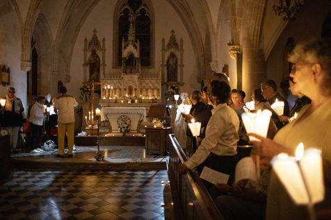 La veille de l'assomption, une centaine de personnes sont venus célébrer la vierge Marie dans le village de la Perrière. Après une marche au flambeau jusqu'à l'église, le prêtre a donné une messe en l'honneur de la vierge Marie. La Perriere, 14 aout 2022.