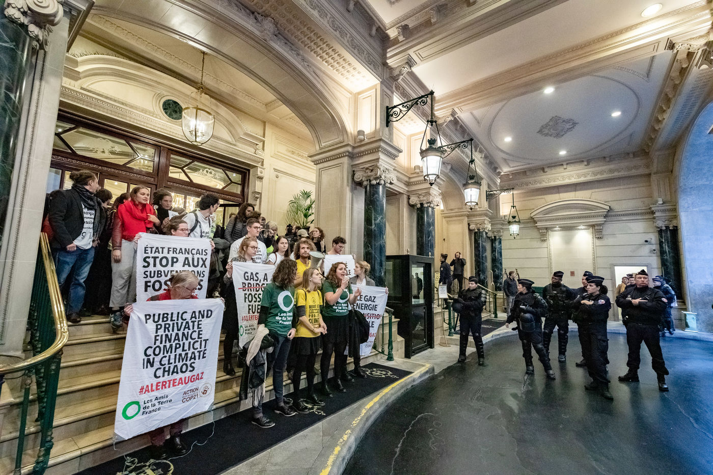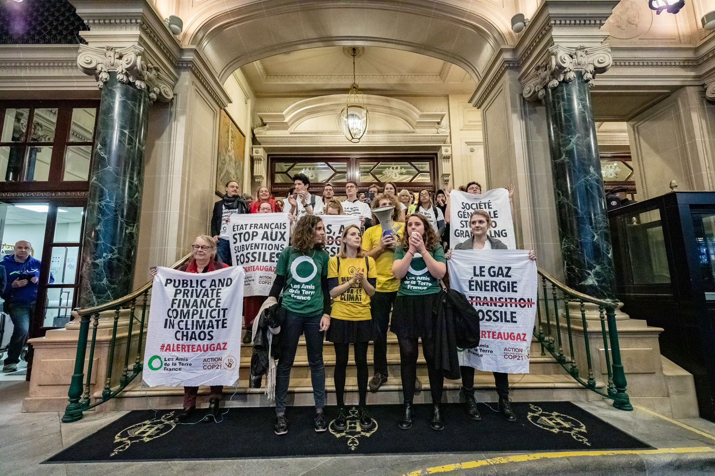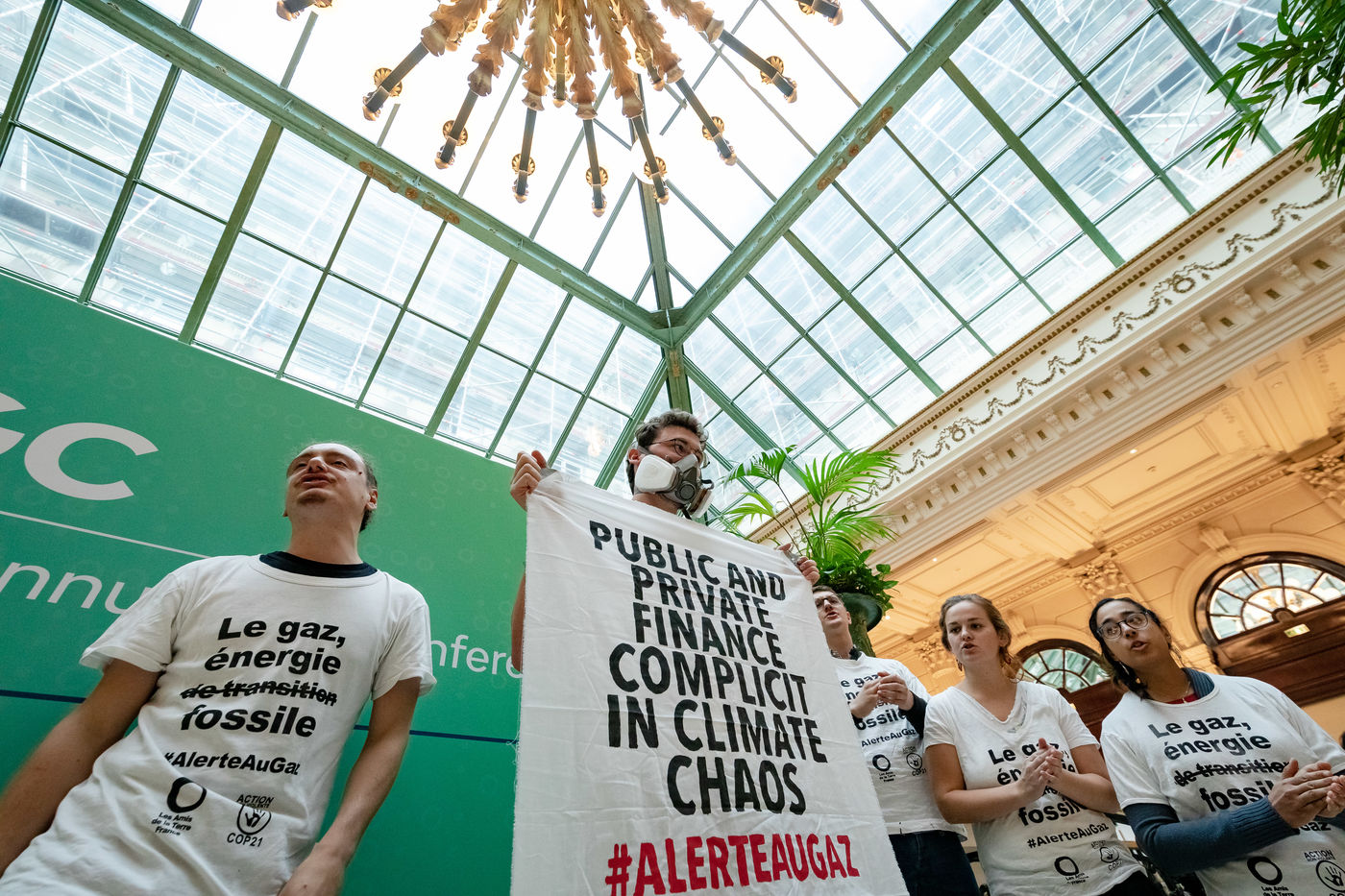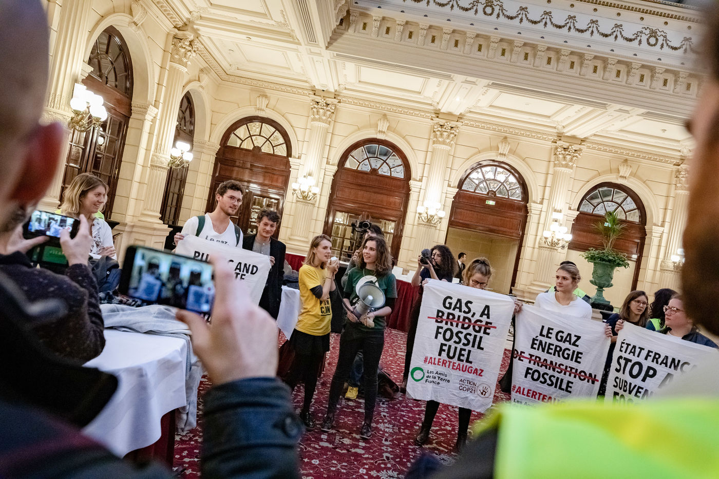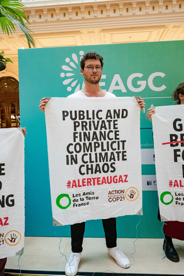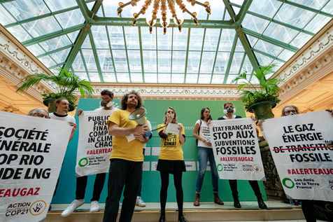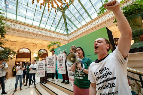 On Wednesday 6 November 2019 in Paris, 91 activists from Les Amis de la Terre and Action Non-Violente COP21 prevented the second day of the European Annual Gas Conference (EAGC), which brings together more than 300 representatives of French and European institutions, the gas industry, and its bankers including Société Générale. Activists call on public and private finance to end their massive support for gas to align with the goal of staying below 1.5°C of global warming.