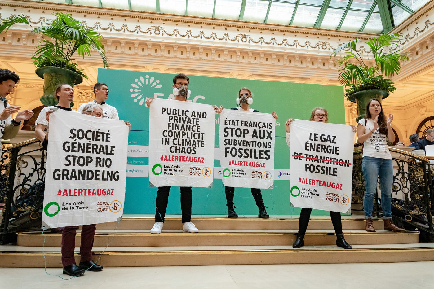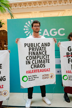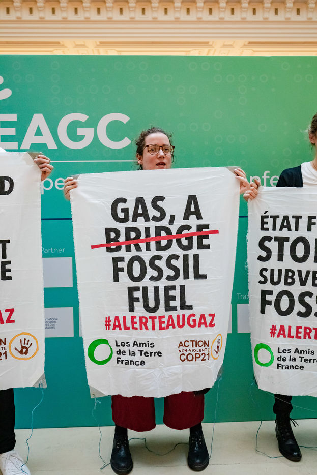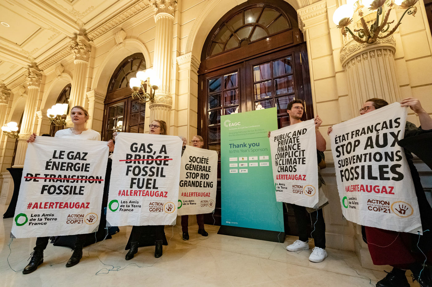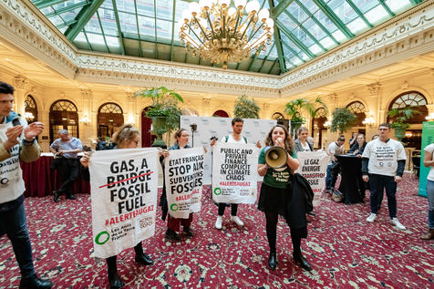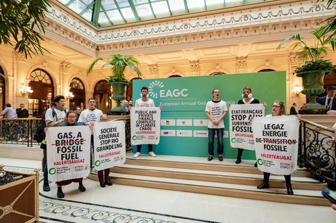 EAGC (European Annual Gas Conference) reunit plus de 300 representants des institutions francaises et europeennes, de l'industrie gaziere, et de ses banquiers dont Societe Generale. Les militants appellent la finance publique et privee a mettre fin a leurs soutiens massifs au gaz pour s'aligner avec l'objectif de rester sous 1,5 °C de rechauffement global.