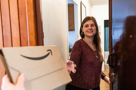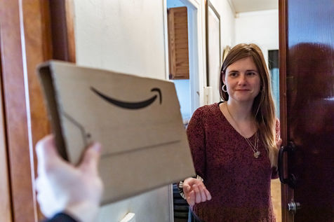 Illustration of a young woman receiving an Amazon package.