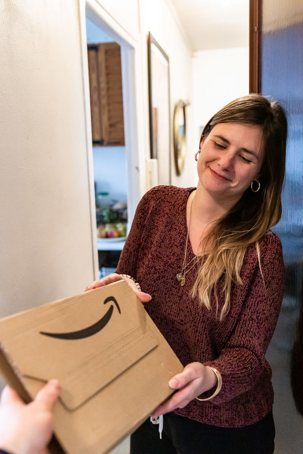 Illustration d une jeune femme qui recoit un colis Amazon.