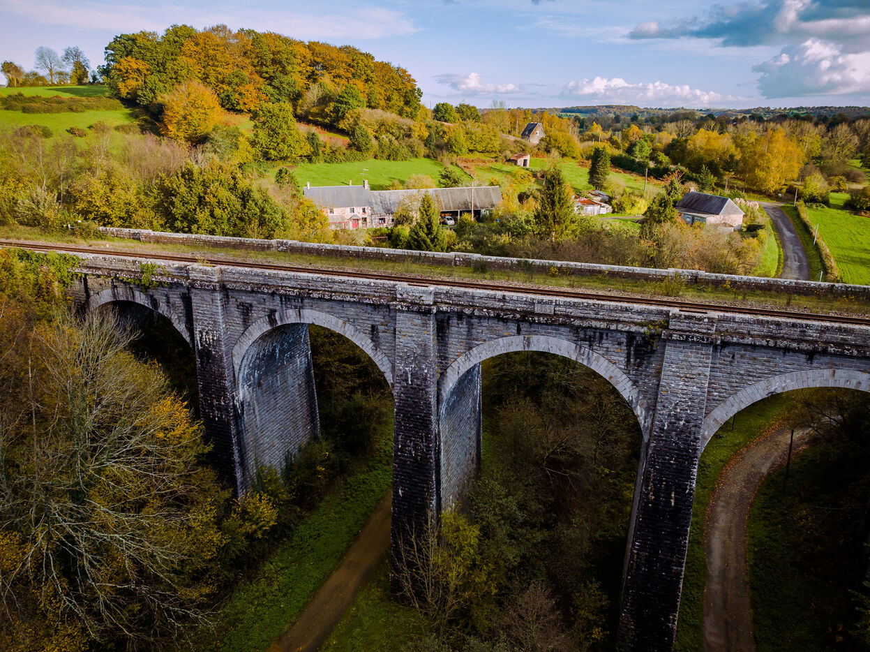 Édifié en 1869 par l?architecte Marcel Delarbre sous Napoléon III, à l?occasion de la mise en service de la ligne ferroviaire Paris-Granville. Son principe de construction utilise des cintres en bois, ainsi que des assises d?encorbellement destinés à supporter les cintres. Ces derniers ont disparu lors du ragrément de l?ouvrage. Il mesure 98.5m de long et 22.5m de haut et enjambe la Vallée de l?Airou.