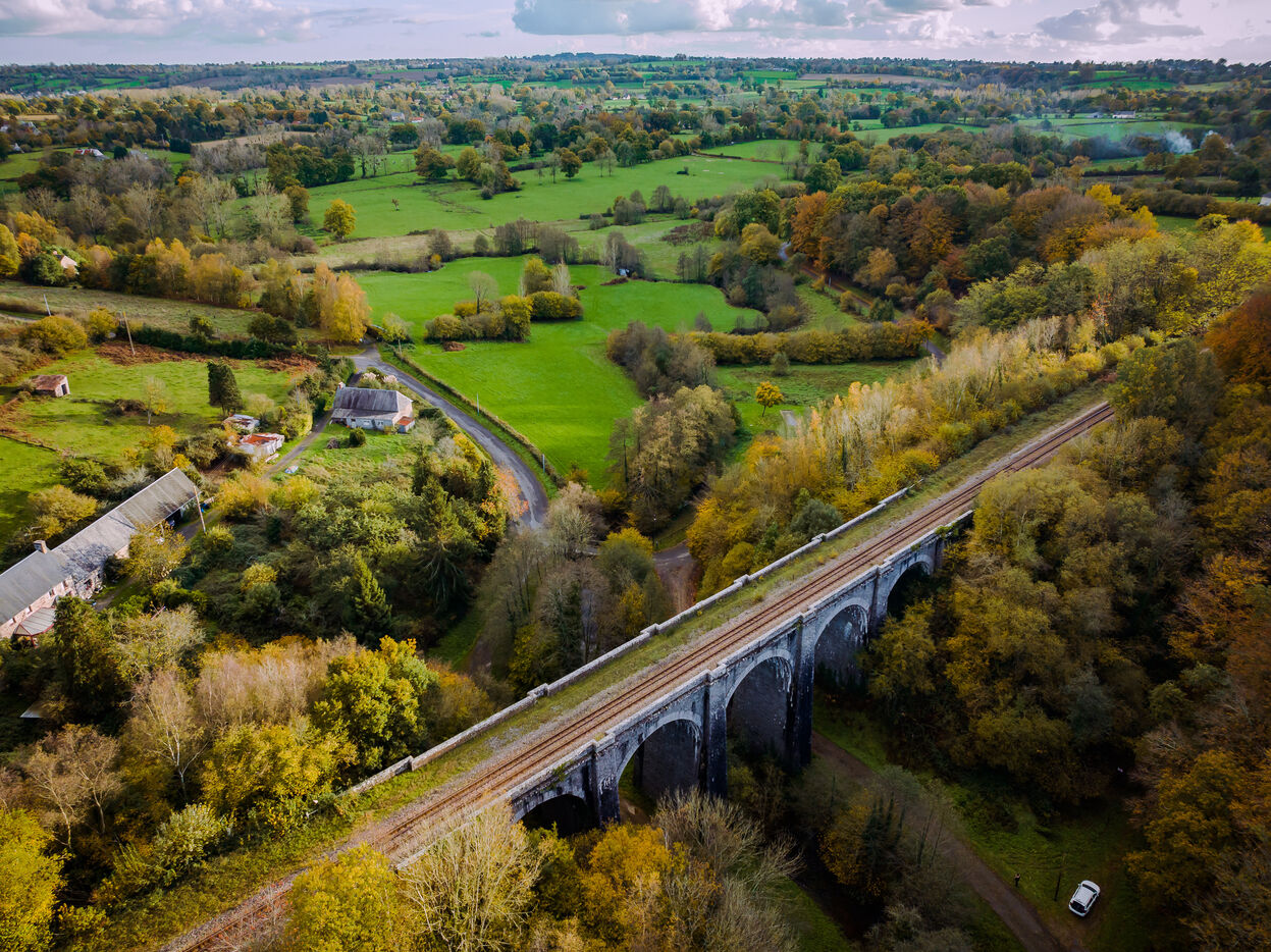 Built in 1869 by architect Marcel Delarbre under Napoleon III, to mark the opening of the Paris-Granville railway line. Its construction uses wooden hangers and corbelled bases to support the hangers. The latter disappeared when the structure was repaired. It is 98.5 m long and 22.5 m high, spanning the Airou Valley.