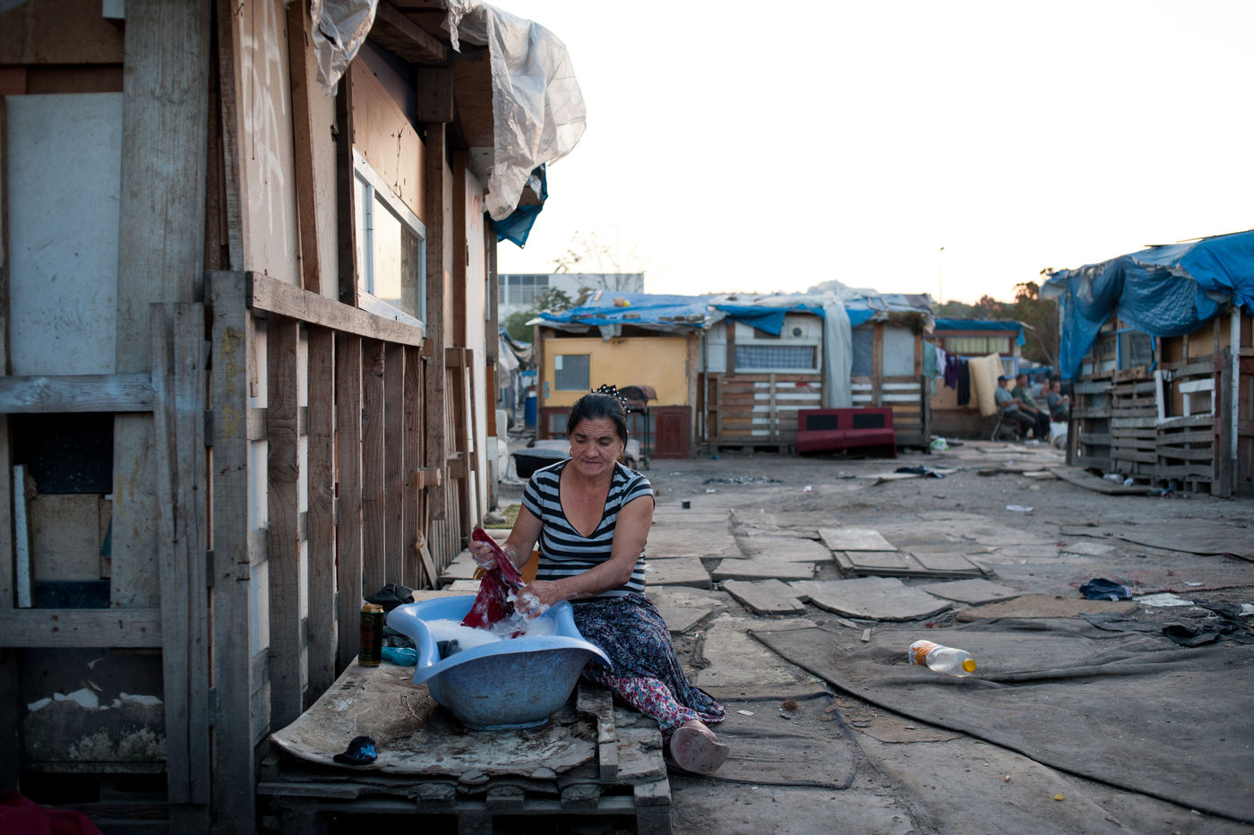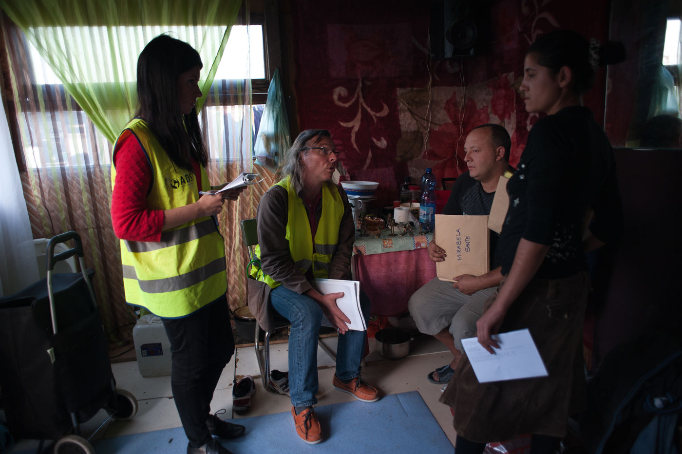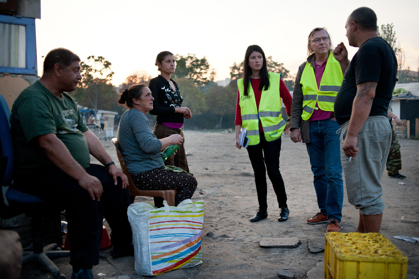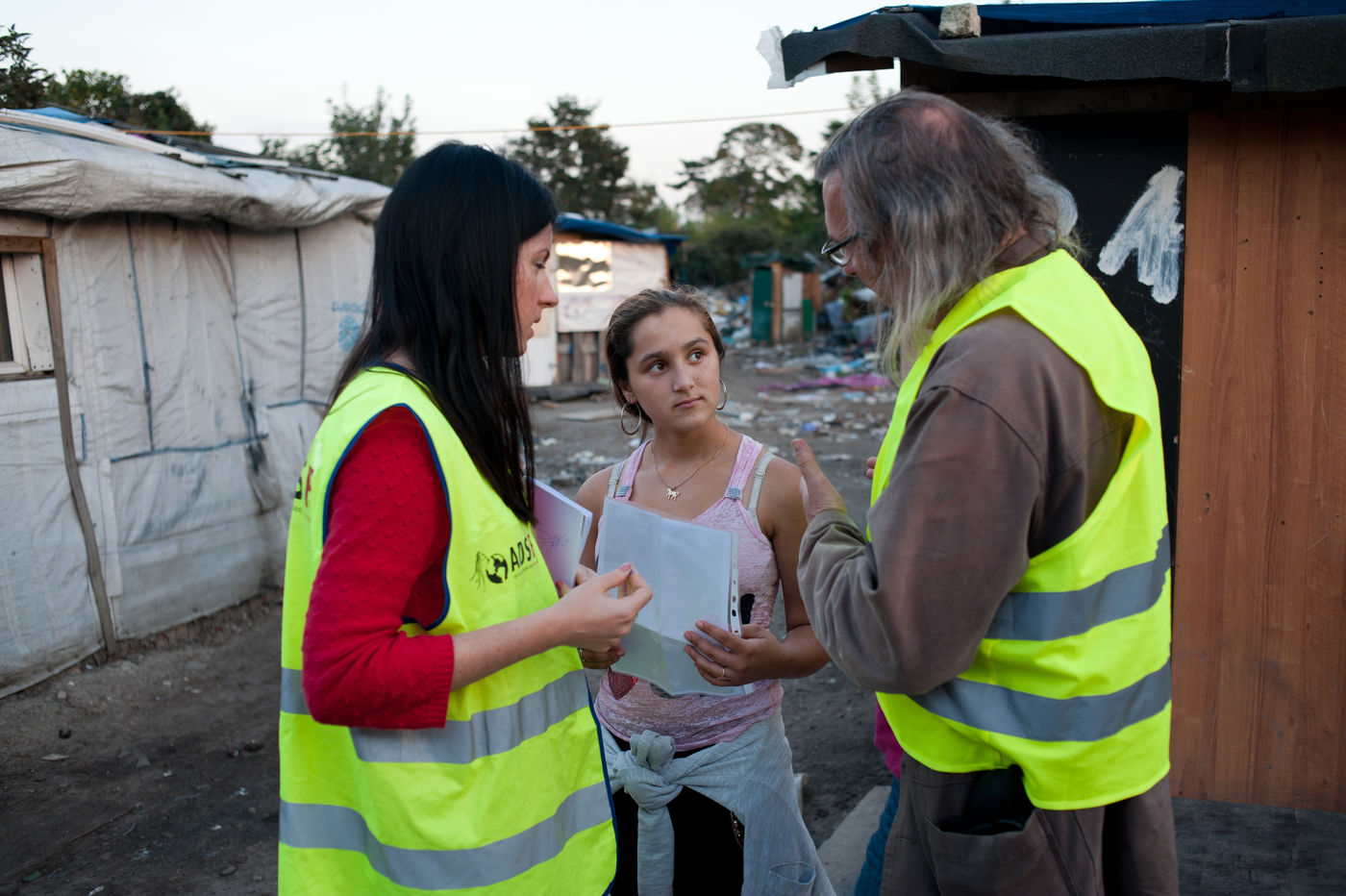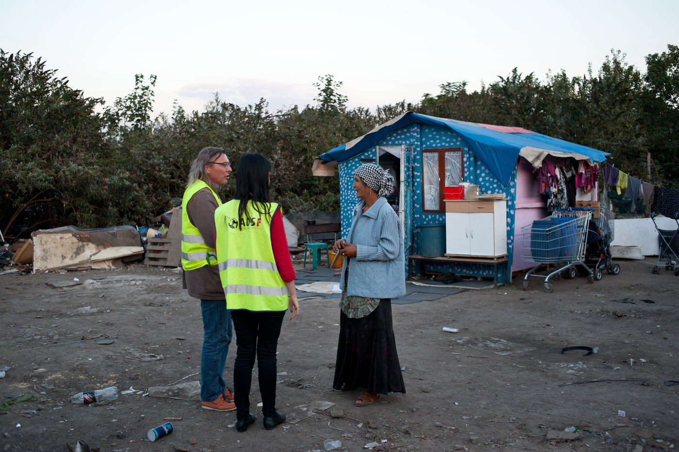 In October 3rd, 2014 - Ivry France - Pilfering in a camp of Roms, by the association ADSF, the association for the development of the health of the women. Bernard Guillon gynecologist at the origin of the association and voluntary Zoé Bisquay go to meet women of the camp.