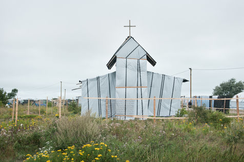 Aout 2015 - Calais . la jungle des migrants. Les cabanes construites par les migrants avec des mate?riaux de re?cupe?ration et d'autre fourni par des associations. Notament le bois et les toiles en fibres, donne?s par Caritas