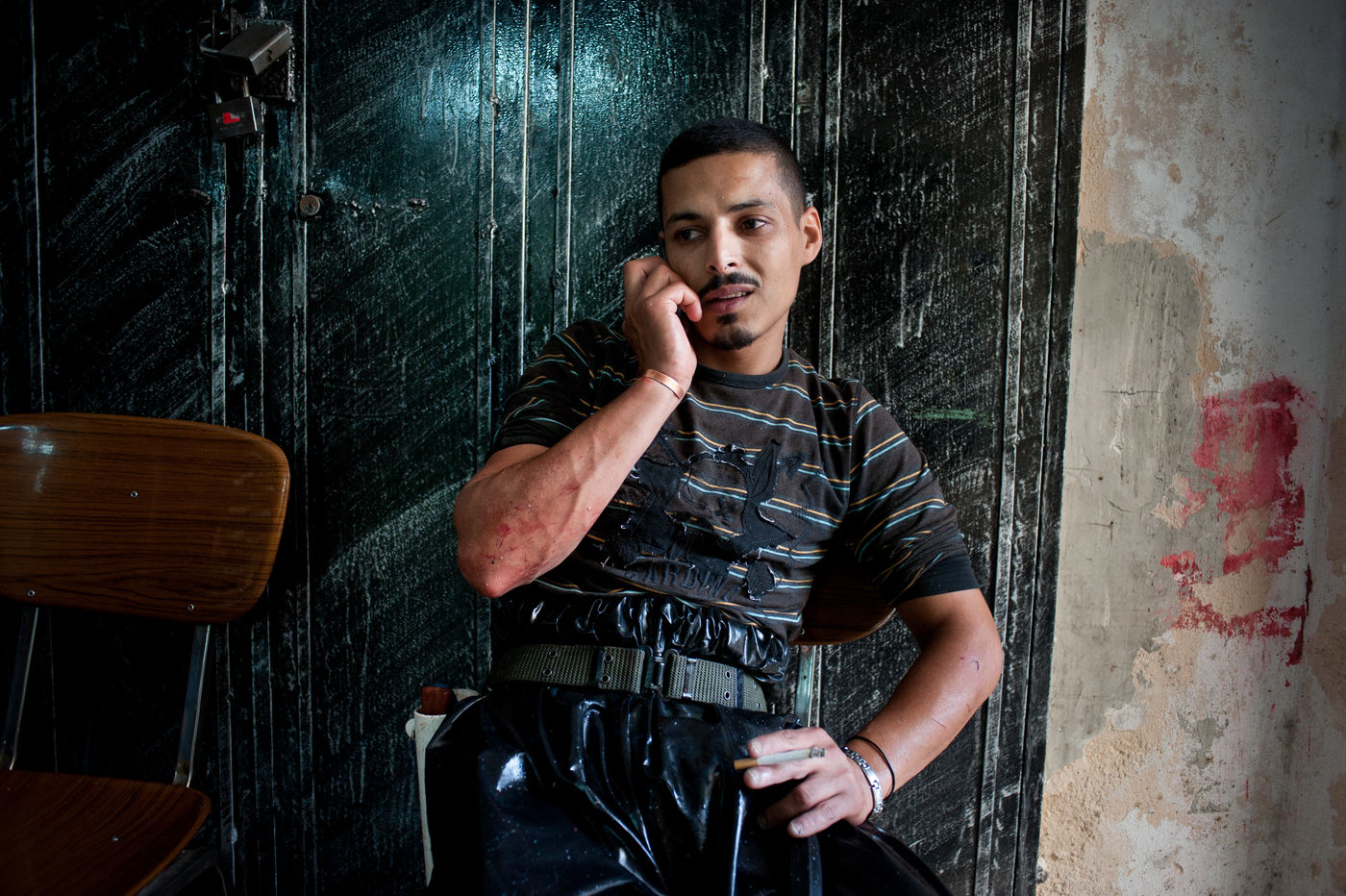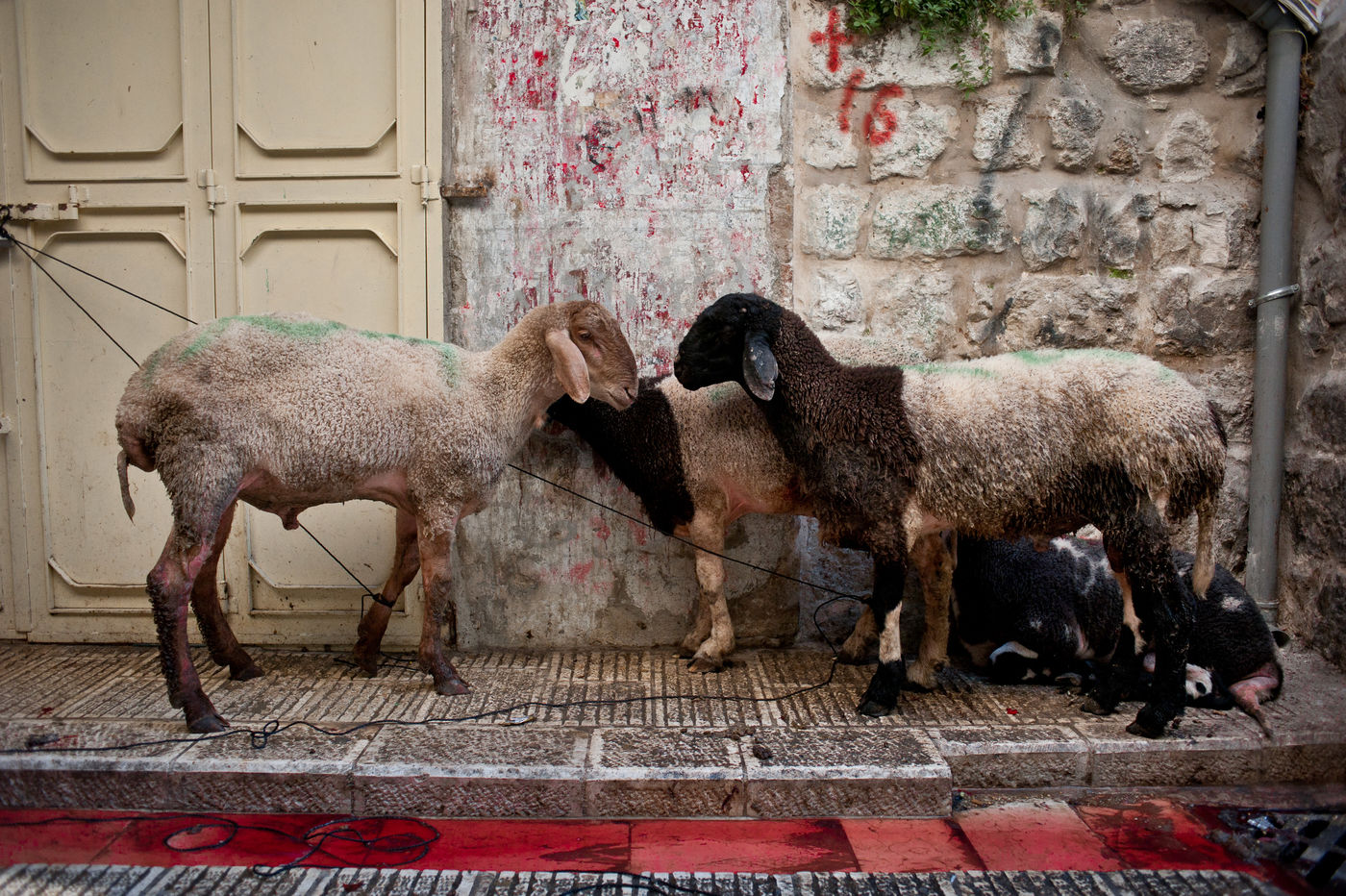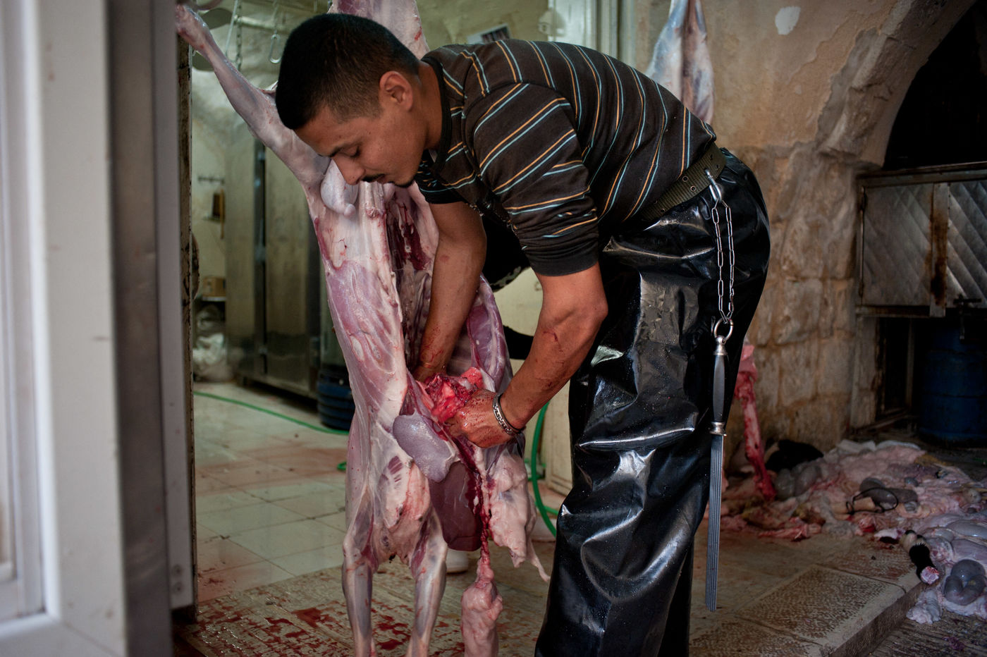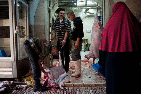 15 octobre 2013-Naplouse en Palestine- Territoires occupés--Pendant de la fête de l'Aïd el kébir. Dans une boucherie de Naplouse le seul commerce ouvert ce jour là. Sacrifice de moutons. Les clients ont achetés leur animal sur pied et repartent avec la viande découpée.