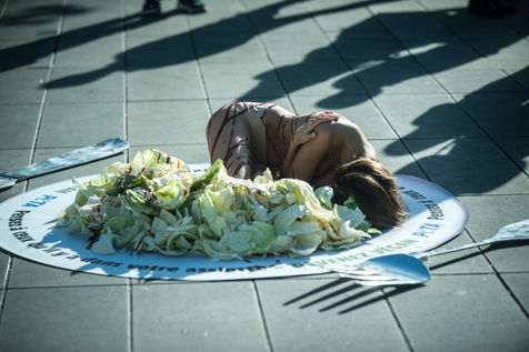 31 octobre 2016 - Paris place de la République. Action de l'association PETA ( People for Ethical Treatment of Animals ) la veille de la journée mondial Végan, ( World Vegan Day). Une femme presque nue couchée dans une assiette géante avec des couverts géants avec comme message "Pensez à ce qu'il y a dans votre assiette" Action pour inetrpeler sur l'élevage animal à destination de la consomation