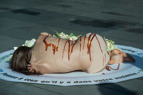In October 31st, 2016 Paris. Action of the association PETA against the consomation of meat, animal products and the breeding for the consomation.