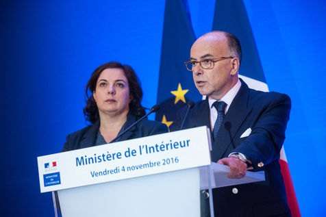 4 novembre 2016 paris, ministère de l'intérieur. Conférence de presse commune de Emmanuelle Cosse et Bernard Cazeneuve sur le démantèlement de la lande de Calais ( jungle ) en cours. Les réfugiés pris en charge sont logés en différents lieux répartis en France.