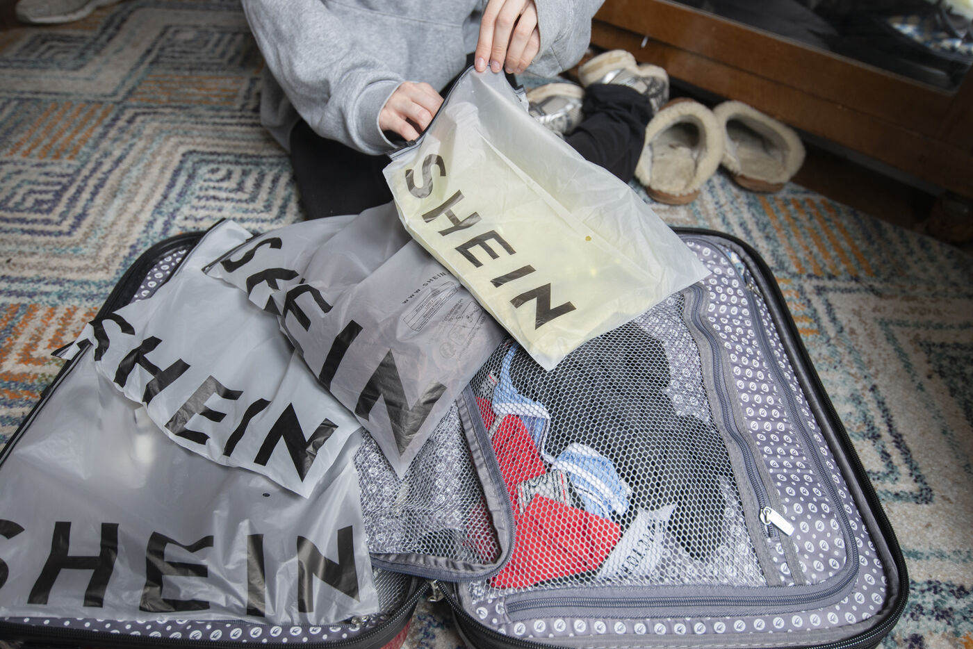 Paris, France - 2025/05/28 : A bag containing clothes ordered from the e-commerce platform SHEIN, delivered to a private customer. The Chinese brand, emblematic of fast fashion, ships thousands of parcels worldwide every day. Photo by Joao Luiz Bulcao / Hans Lucas.