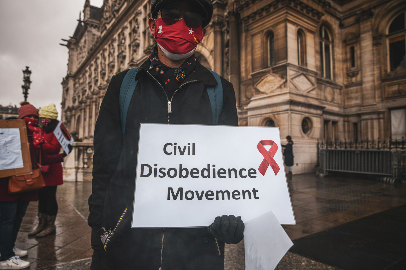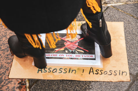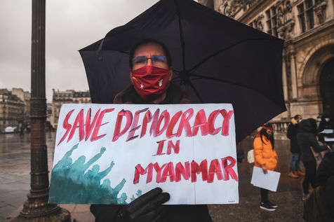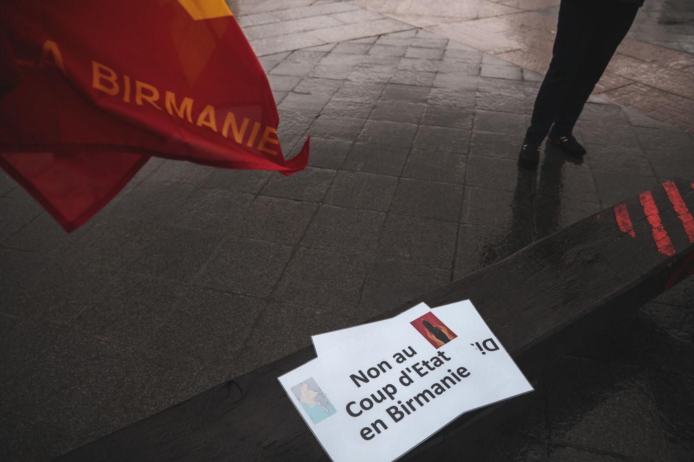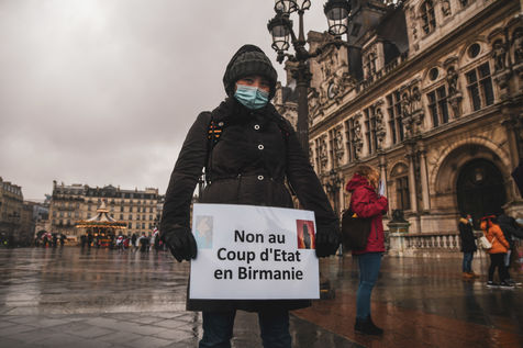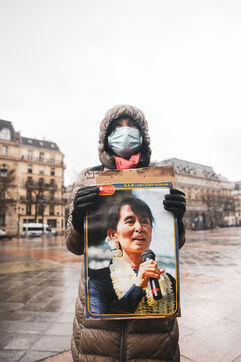 Rassemblement sur la place de l'hôtel de ville de Paris contre le coup d'état de l'armée et l'arrestation et l'assignation à résidence de l'ex-dissidente birmane Aung San Suu Kyi devenue première ministre depuis 2016.