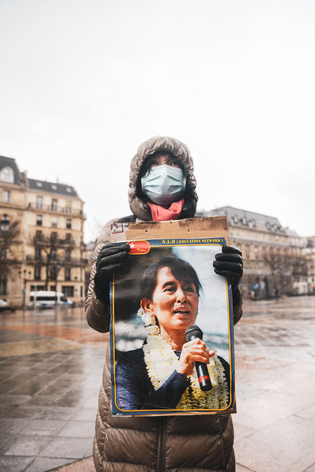 Rally in the town hall square in Paris against the army coup and the arrest and house arrest of ex-Burmese dissident Aung San Suu Kyi, who became prime minister since 2016.