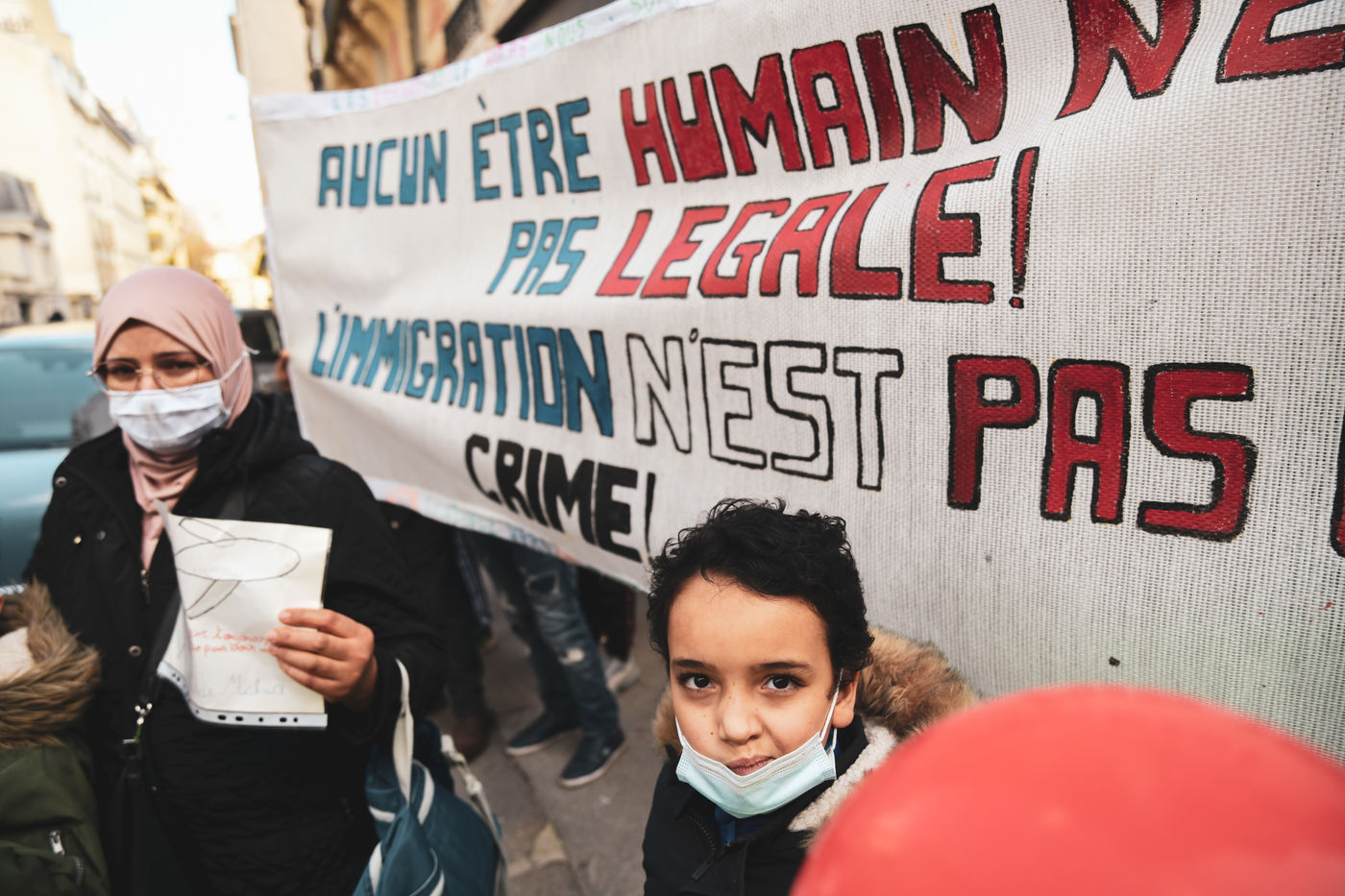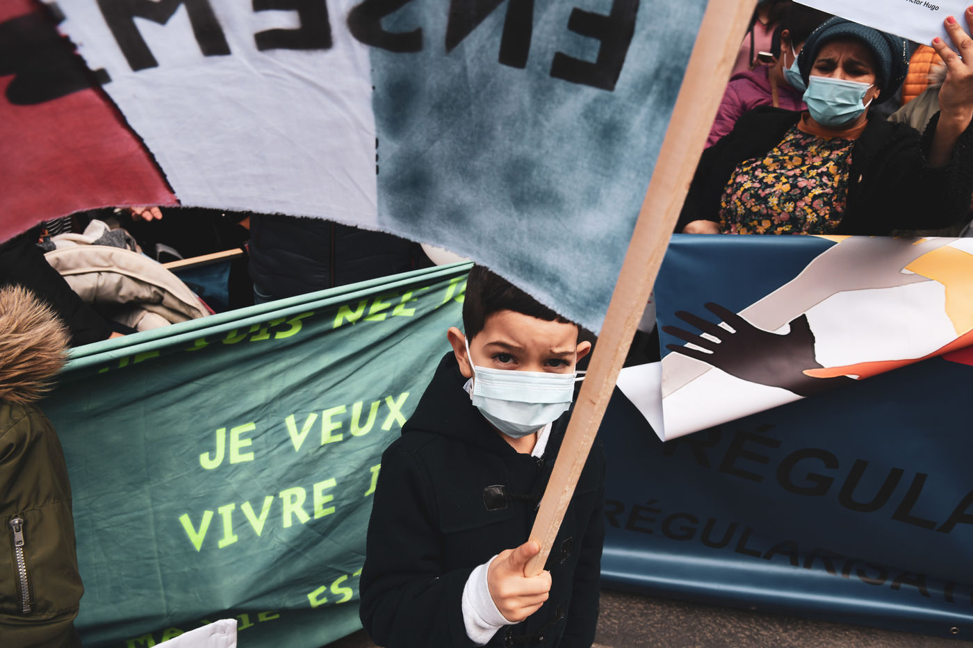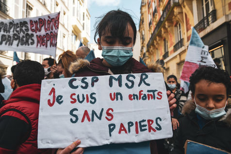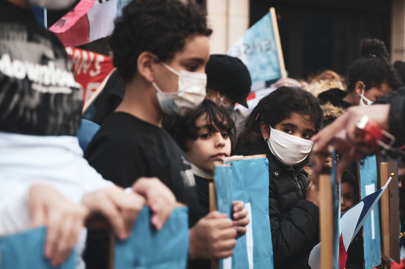 Gathering at the doors of the Ministry of Education at the call of the association Ensemble to raise awareness and demand the regularization of undocumented families with children in school and isolated minors. Paris, France. February 23, 2021.