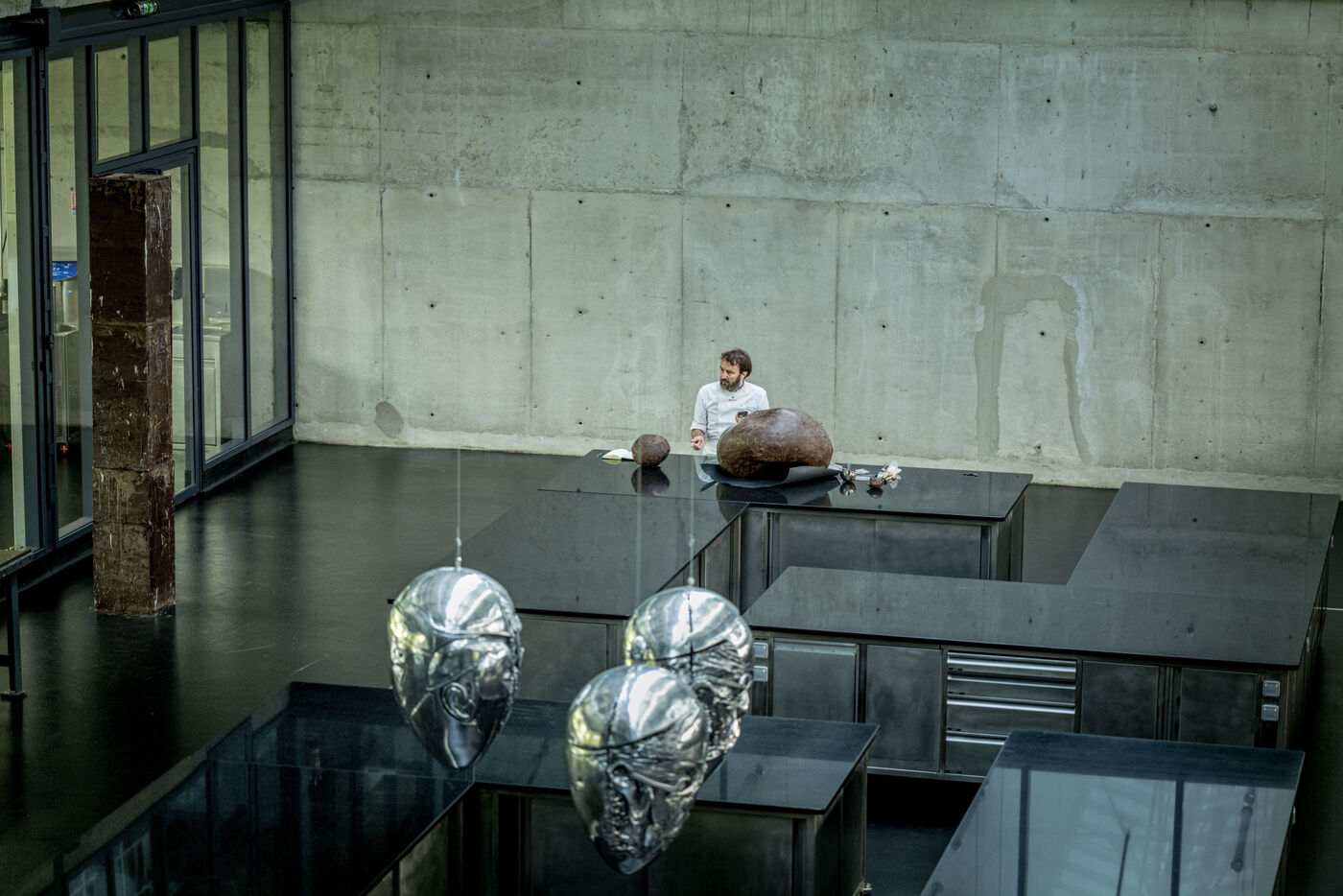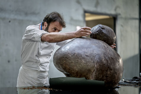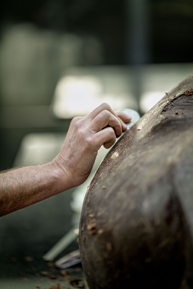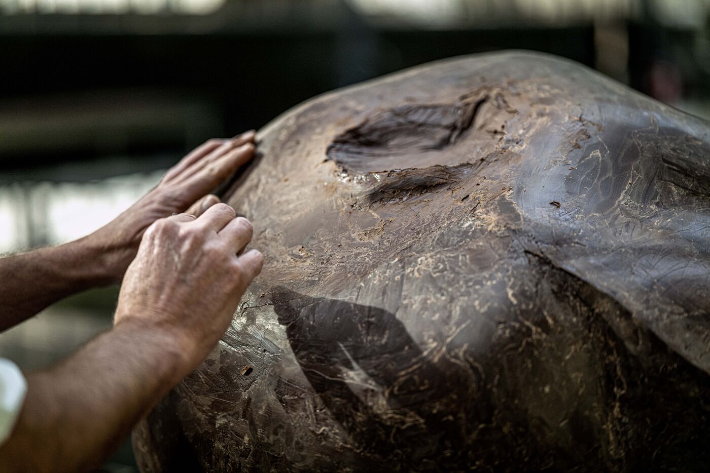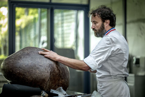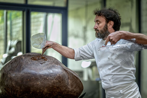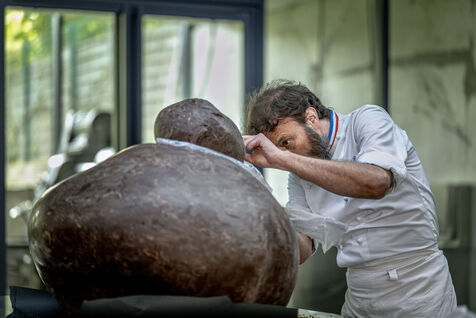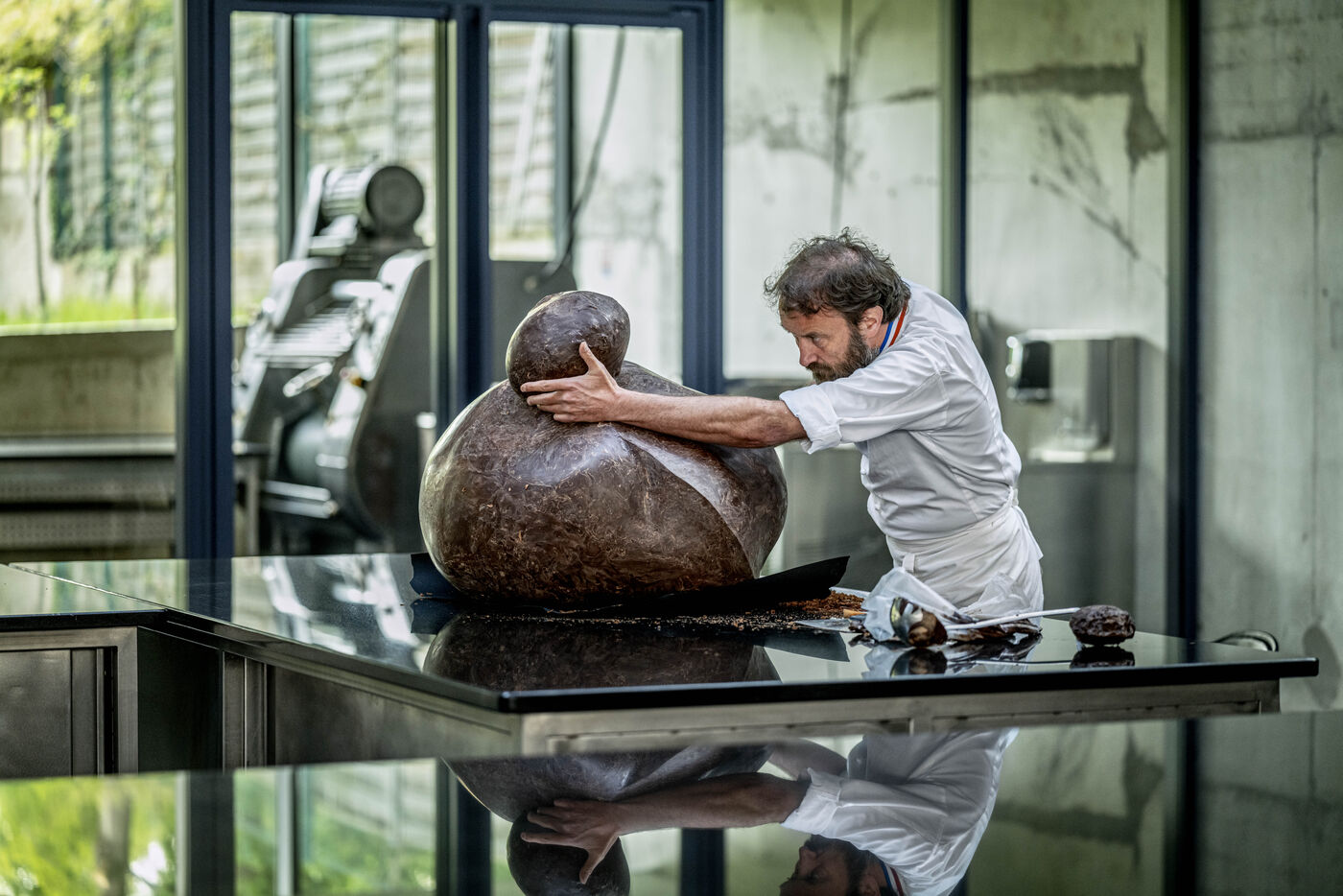Meeting with Patrick Roger, MOF chocolatier, in his laboratory workshop in Sceaux, to see him sculpting his next creation in chocolate. Know-how, technique, but above all commitment of the body in the service of the material.