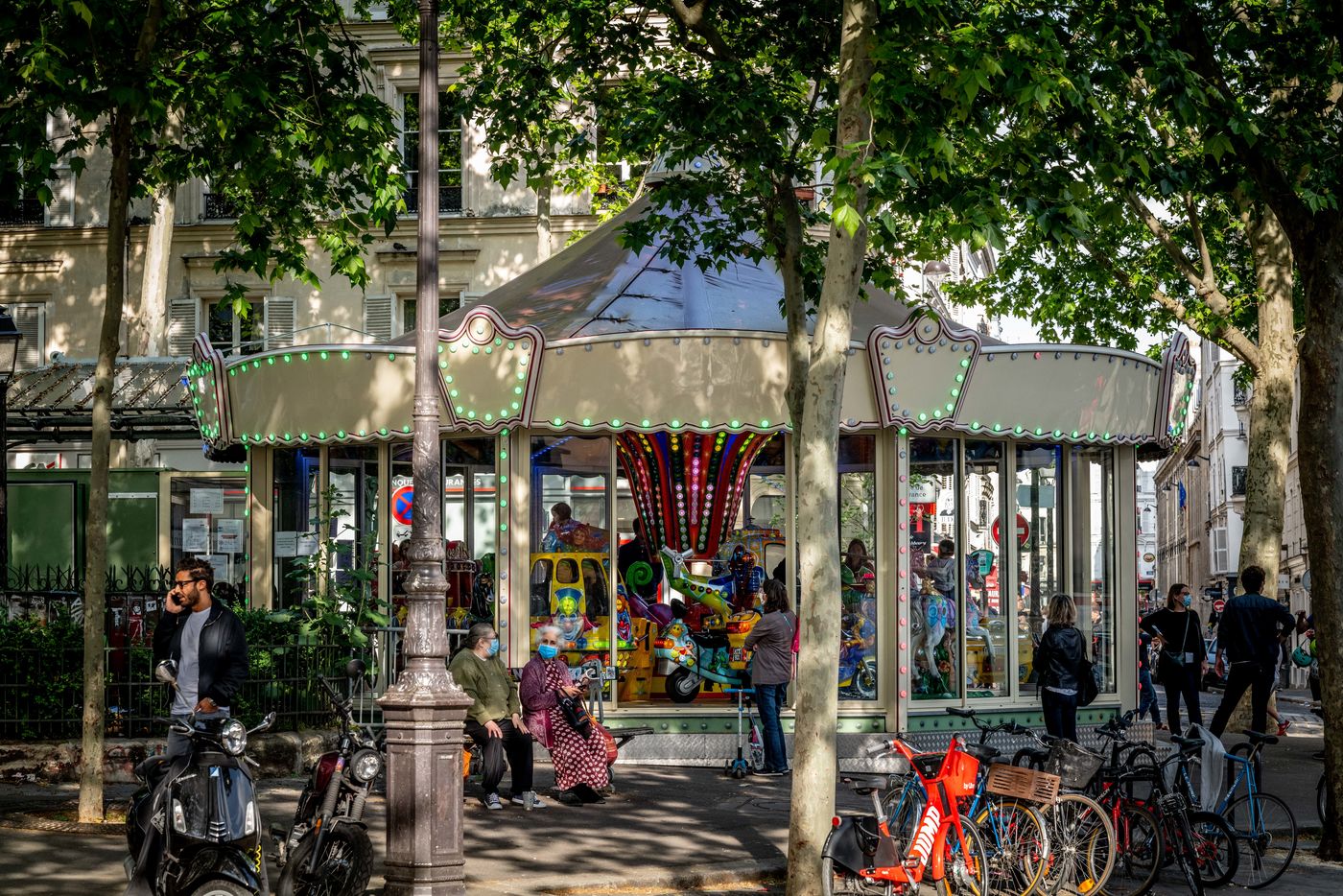 Sunday May 24, 2020, following the COVID-19 health crisis and in the midst of deconfinement, while parks are still forbidden to the public, the Place des Abbesses carousel is open. Posters inform about the rules of distance to be respected, but no cleaning of the merry-go-round between each round.