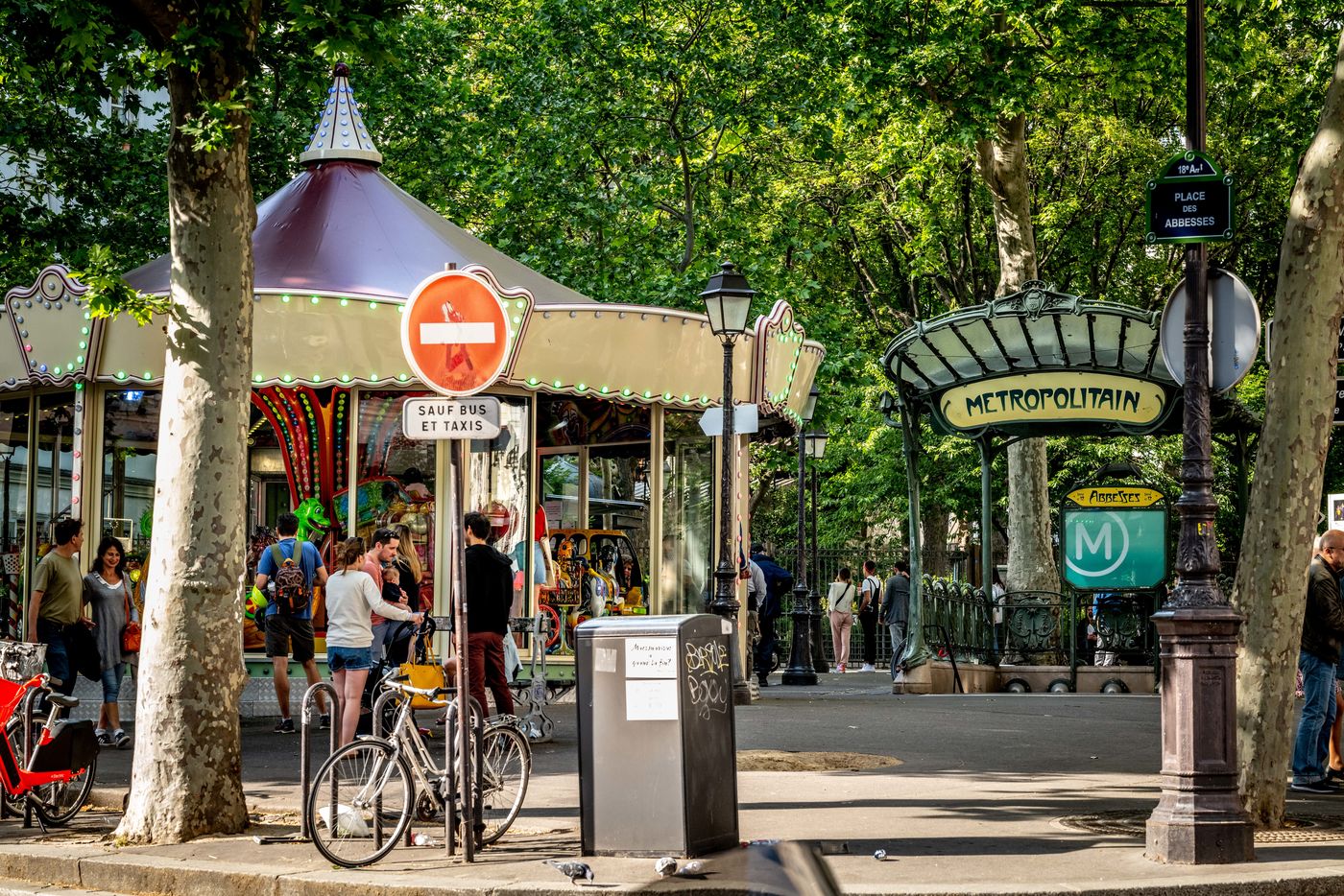 Dimanche 24 Mai 2020, suite à la crise sanitaire du COVID-19 et en pleine phase de déconfinement, alors que les parcs sont toujours interdits au public, le manège de la Place des Abbesses est ouvert. Des affichettes informent des règles de distanciation à respecter, mais pas de nettoyage du manège entre chaque tour.