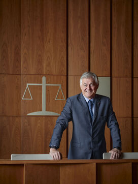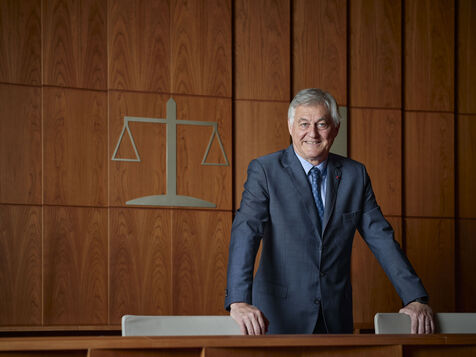 Portraits of Patrick Sayer, President of the Paris Commercial Court, in the international litigation courtroom.