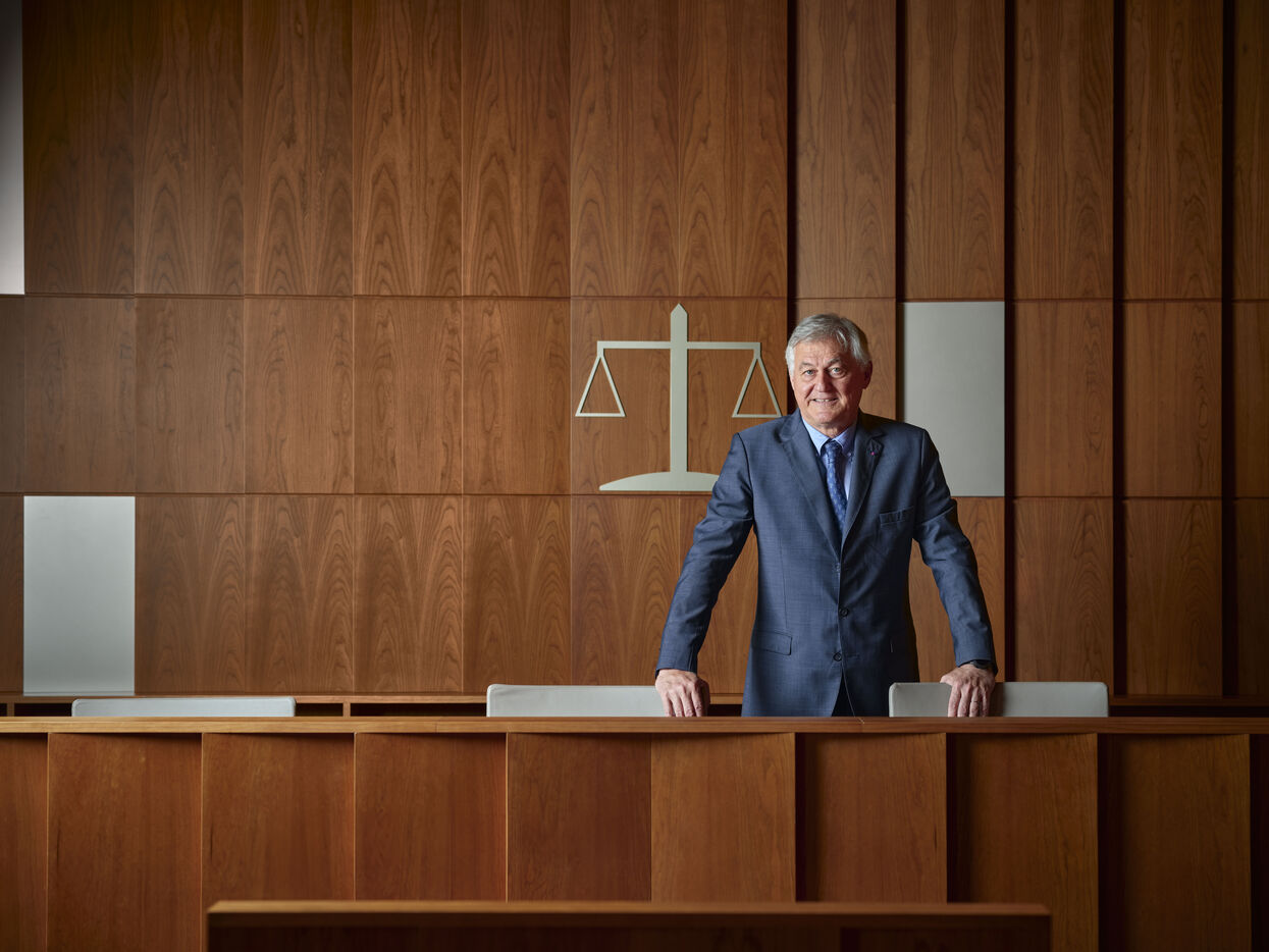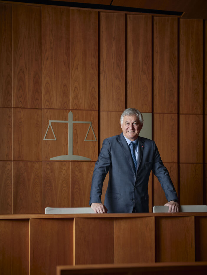 Portraits de Patrick Sayer, président du Tribunal de Commerce de Paris, dans la salle d'audience des litiges internationaux.