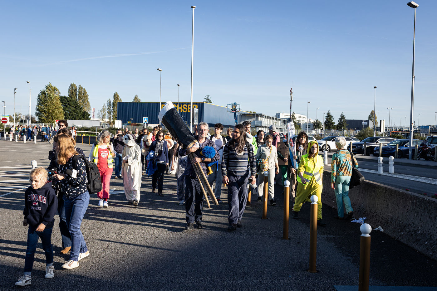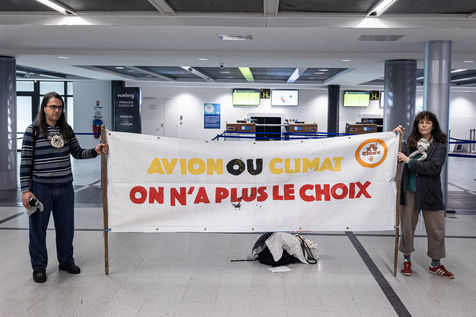 Action of civil disobedience at the Nantes Atlantique airport organized by the GIGNV to protest against the noise, environmental and climatic nuisances linked to air traffic and the non-respect of the curfew, normally in force at the Nantes airport. The GIGNV (Groupe d'Intervention des Grenouilles Non Violentes) is a citizen collective from Loire-Atlantique which fights for social and climatic justice by organizing non-violent actions of civil disobedience.