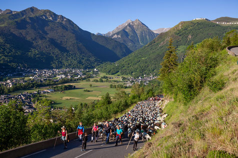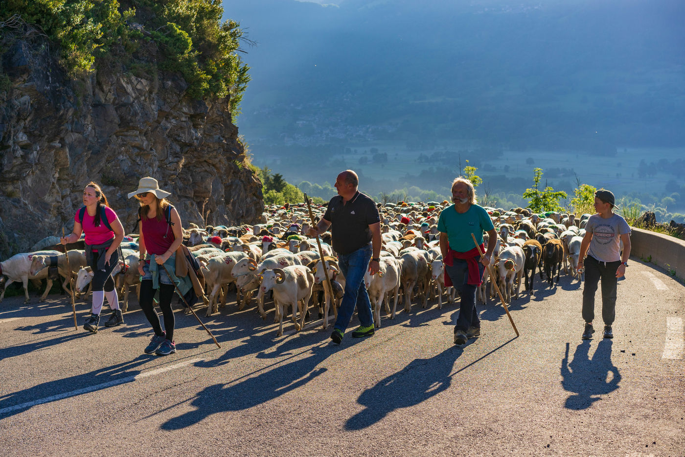 Transhumance de Soulan, montée en estive de 700 brebis vers leur paturage d'été au dessus du village de Soulan dans les Hautes-Pyrenees.