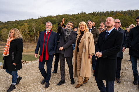 Official visit by Dominique Faure, French Minister for Local Government and Rural Affairs, to the Savères dam construction site in the Haute-Garonne region of Occitanie.