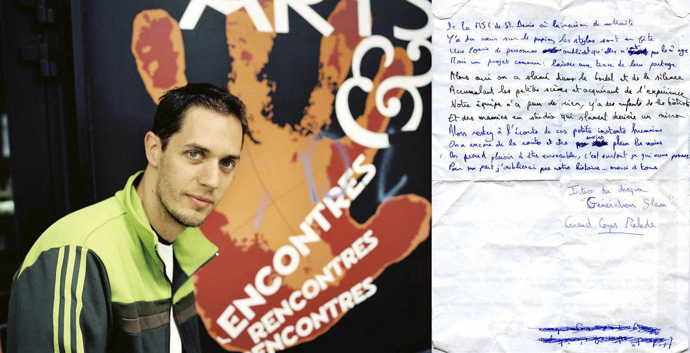 Des archives de Grand Corps Malade. Portraits, scène, en studio pour son second album "Enfant de la ville" et dans la peau d'animateur d'ateliers d'écriture slam inter-generation.