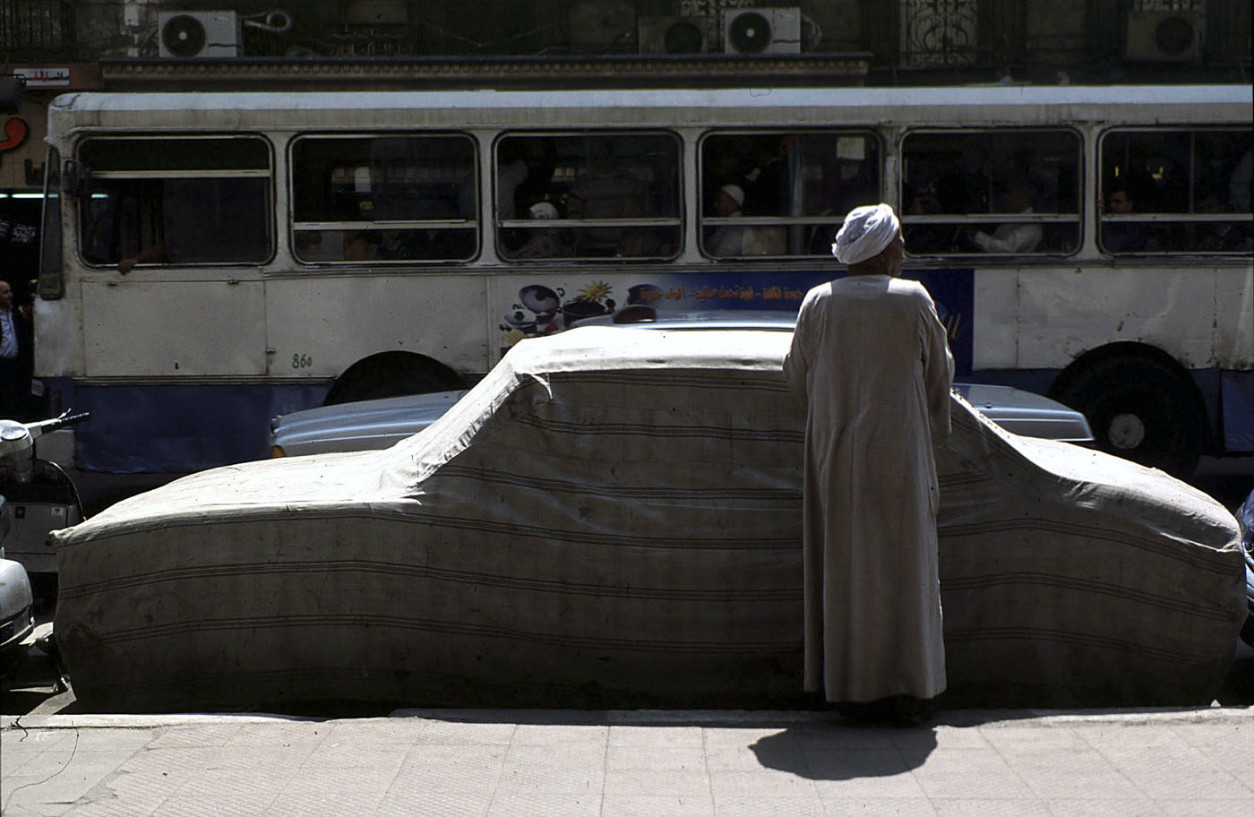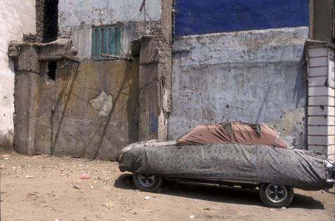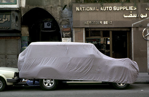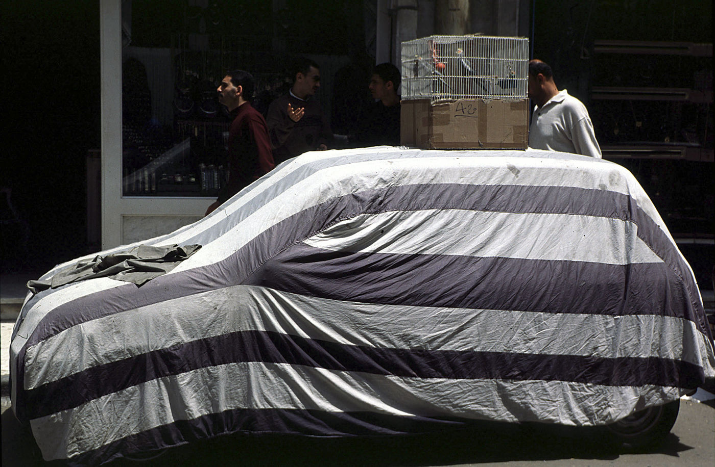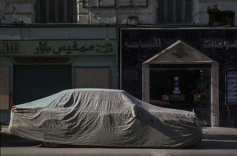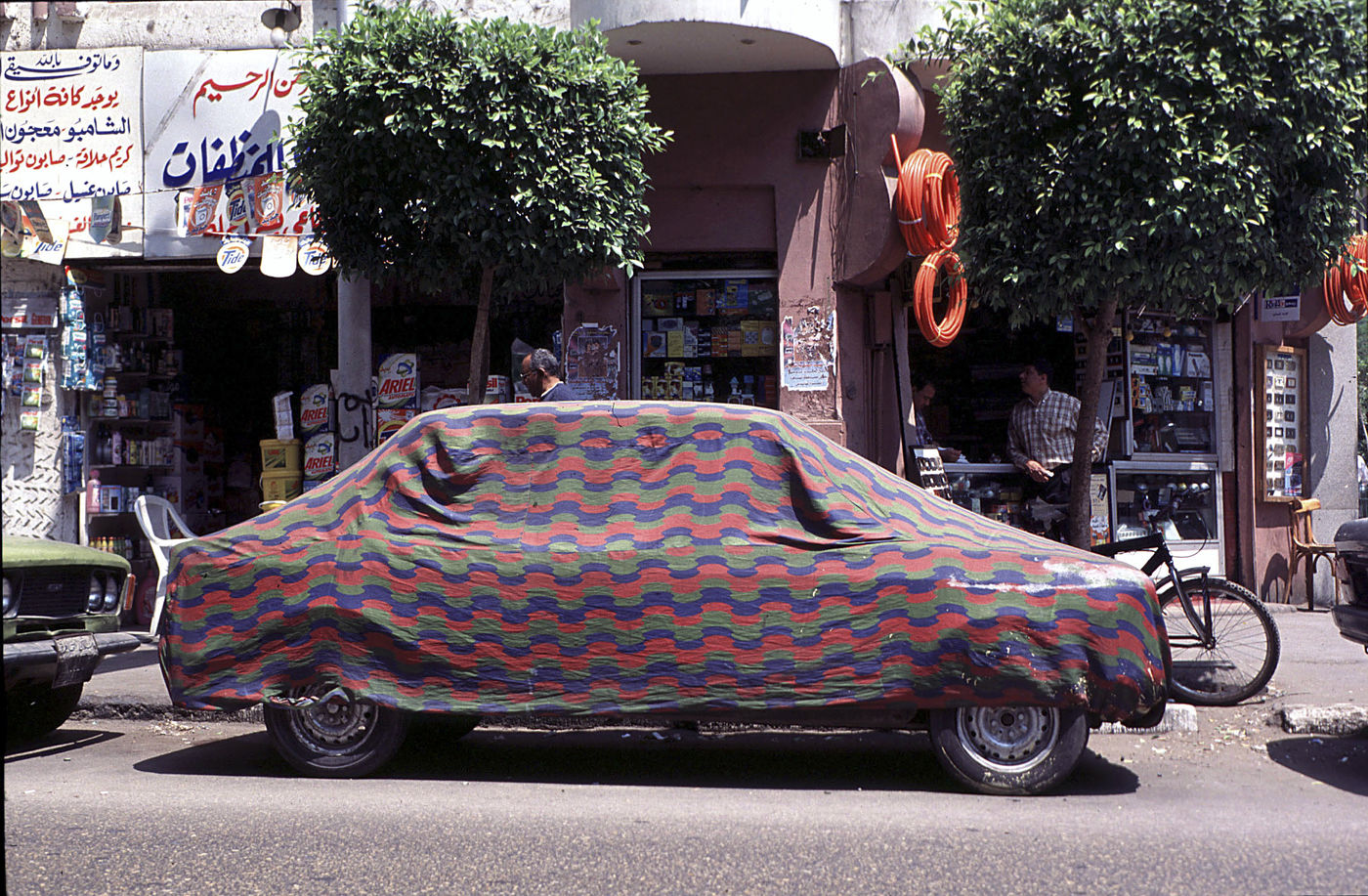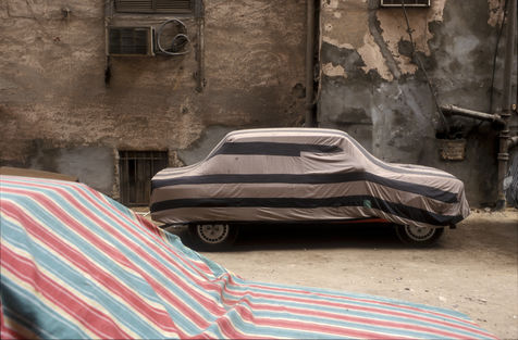 During a trip to Egypt, I noticed these tarpaulins covering parked cars. Finding the phenomenon too recurrent not to be funny, I photographed some of them. These tarpaulin-covered cars, once enclosed in the rectangle of the photo, took on a dimension that I hadn't sensed when I first saw them. They had taken on a meaning of their own, in a purer frame. They became characters draped in colour, life, humour, history and stories. With its veil, the car leaves its role, it is no longer "the object of mass consumption", nor the simple illustration of "modern life". It is no longer the object of mass consumption, nor is it a mere illustration of "modern life". It is no longer the object of masculinity, nor does it carry the heavy duties of power or wealth that its owner usually imposes on it. Here, hidden under her personalized canvas, she becomes playful, seductive, feminine, and suddenly allowed to witness the passage of time. The covered cars belong to the turbulent streets of cities, their impromptu markets, the unusual scenes that take place there, their dilapidated theatre sets. The car is a dressed actress, whose dress and scene accompany her identity. A harmony is established, born from the alliance of the model and its canvas with the small details of the frenetic life of the street. So I photograph the covered car that has a meaning in her city. I avoid isolating it from its frame. I want to play with the background, the environment, chance. Without wanting to, and without knowing it, the owners of these covered vehicles practice a form of urban art, an art brut and spontaneous. I want to be a simple witness of their work, to show a simple and laughing Egypt, the colourful and artistic life of the street through these unusual cars whose make and bodywork are unknown.