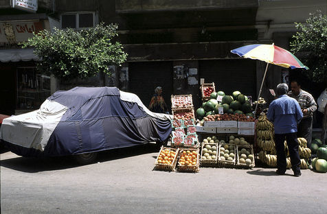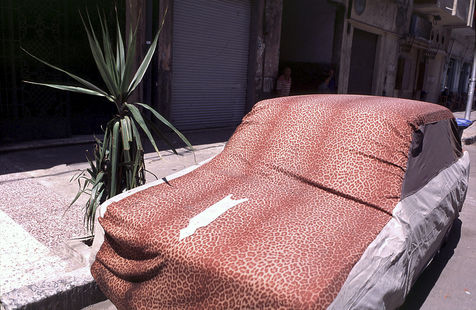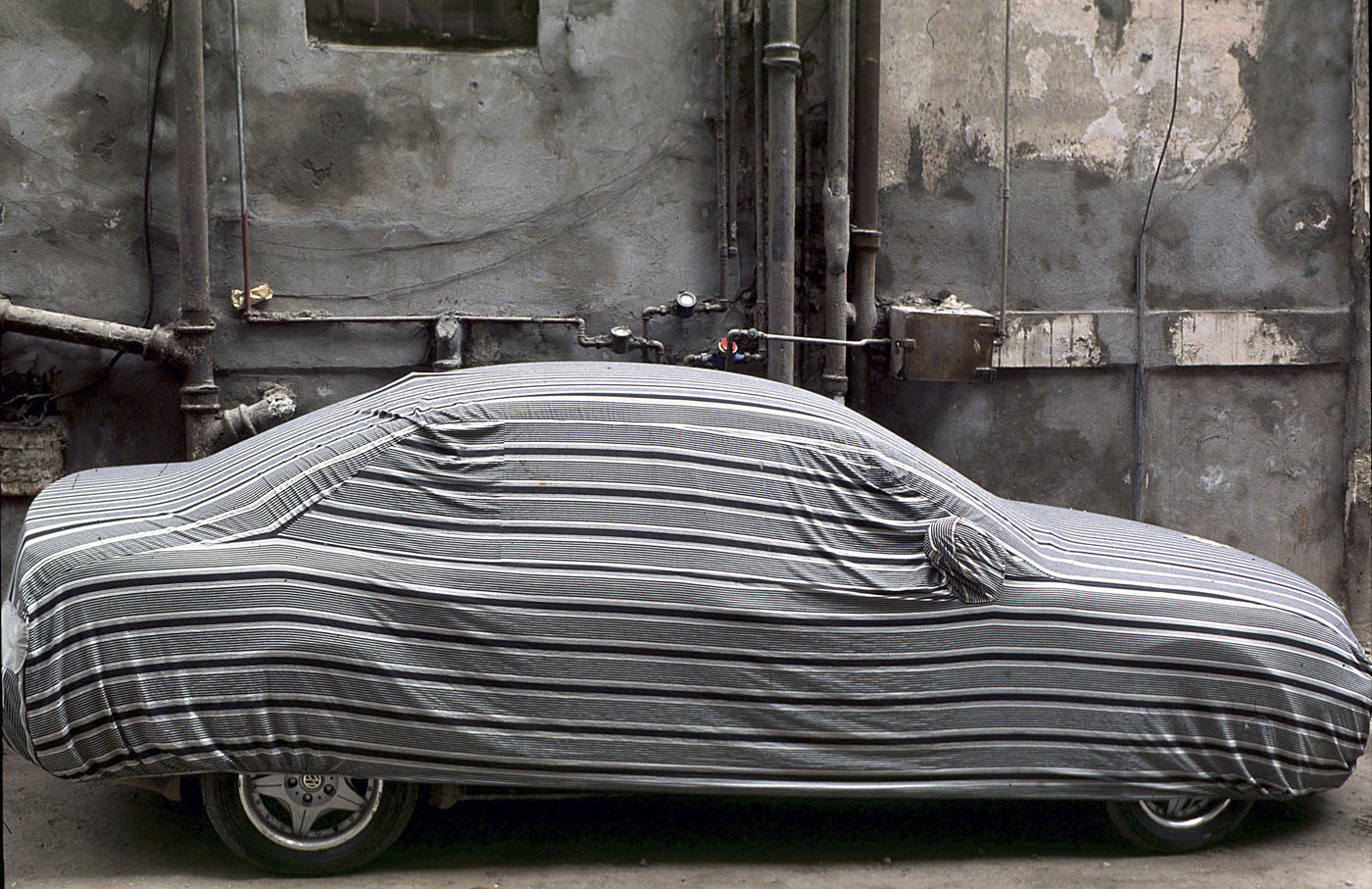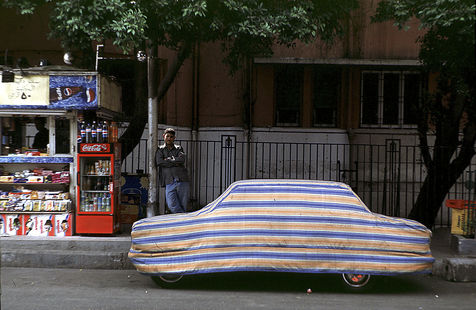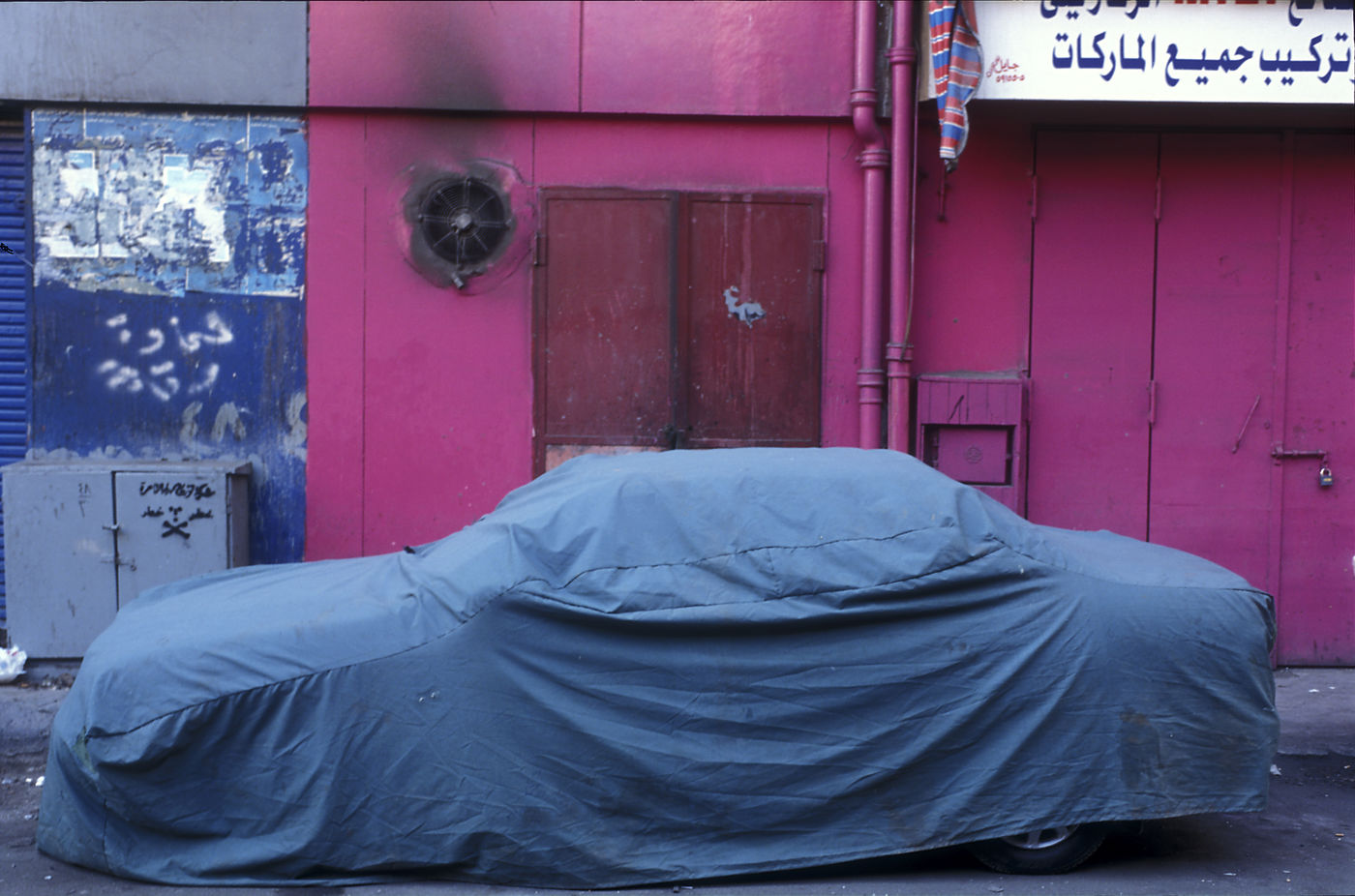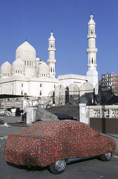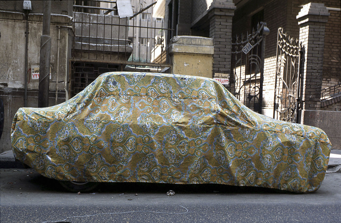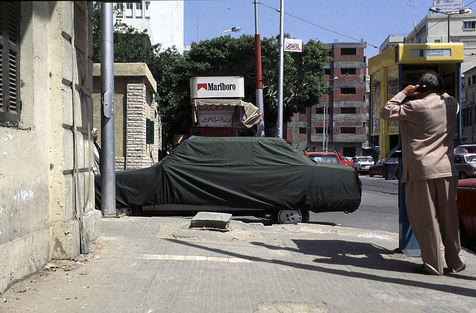 During a trip to Egypt, I noticed these tarpaulins covering parked cars. Finding the phenomenon too recurrent not to be funny, I photographed some of them. These tarpaulin-covered cars, once enclosed in the rectangle of the photo, took on a dimension that I hadn't sensed when I first saw them. They had taken on a meaning of their own, in a purer frame. They became characters draped in colour, life, humour, history and stories. With its veil, the car leaves its role, it is no longer "the object of mass consumption", nor the simple illustration of "modern life". It is no longer the object of mass consumption, nor is it a mere illustration of "modern life". It is no longer the object of masculinity, nor does it carry the heavy duties of power or wealth that its owner usually imposes on it. Here, hidden under her personalized canvas, she becomes playful, seductive, feminine, and suddenly allowed to witness the passage of time. The covered cars belong to the turbulent streets of cities, their impromptu markets, the unusual scenes that take place there, their dilapidated theatre sets. The car is a dressed actress, whose dress and scene accompany her identity. A harmony is established, born from the alliance of the model and its canvas with the small details of the frenetic life of the street. So I photograph the covered car that has a meaning in her city. I avoid isolating it from its frame. I want to play with the background, the environment, chance. Without wanting to, and without knowing it, the owners of these covered vehicles practice a form of urban art, an art brut and spontaneous. I want to be a simple witness of their work, to show a simple and laughing Egypt, the colourful and artistic life of the street through these unusual cars whose make and bodywork are unknown.