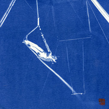 The circus has come to town. I went to meet the circus. For a week, they welcomed me in the middle of the caravans, during rehearsals and I attended many performances. I rewrote these images using an old monochrome negative photographic process, the cyanotype. Thanks to UV light (from the sun or from a lamp), we obtain a Prussian blue, cyan blue photographic print. This technique was developed in 1842 by the English scientist and astronomer John Frederick William Herschel.