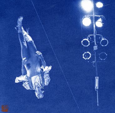 Le cirque est arrive en ville. Je suis alle a la rencontre des circassiens. Pendant une semaine, ils m ont accueilli au milieu des caravanes, pendant les repetitions et j ai assiste a de nombreuses representations. Ces images, je les ai reecrites en utilisant un procede photographique monochrome negatif ancien, le cyanotype. Gace aux UV (du soleil ou d une lampe), on obtient un tirage photographique bleu de Prusse, bleu cyan. Cette technique a ete mise au point en 1842 par le scientifique et astronome anglais John Frederick William Herschel.