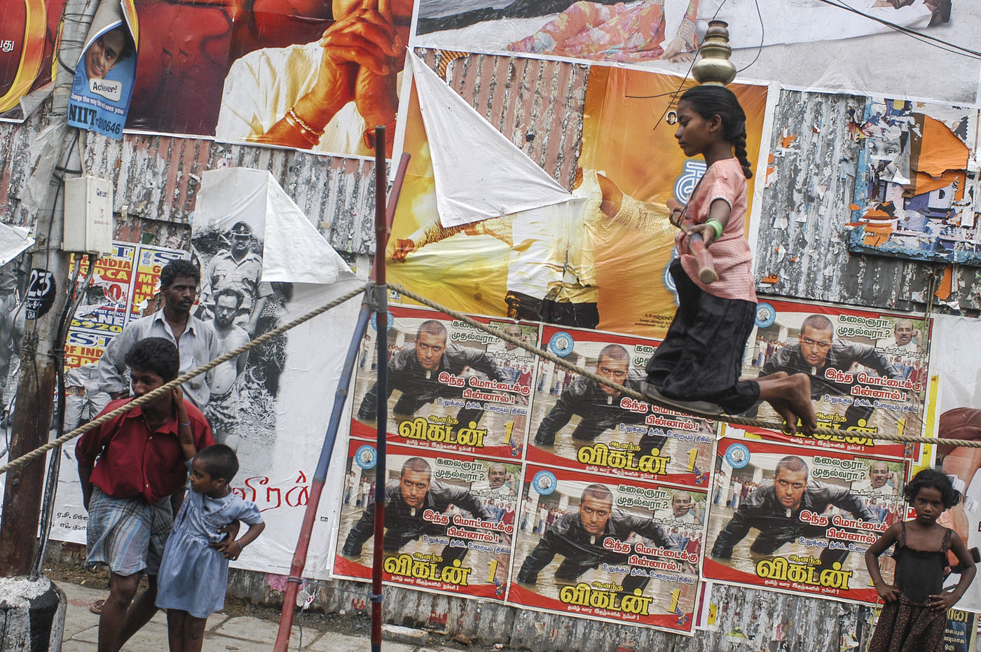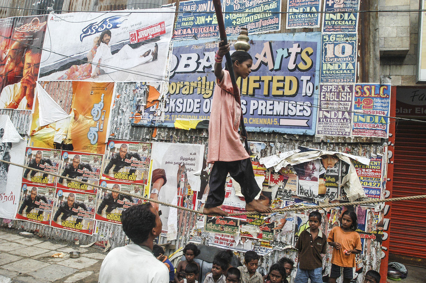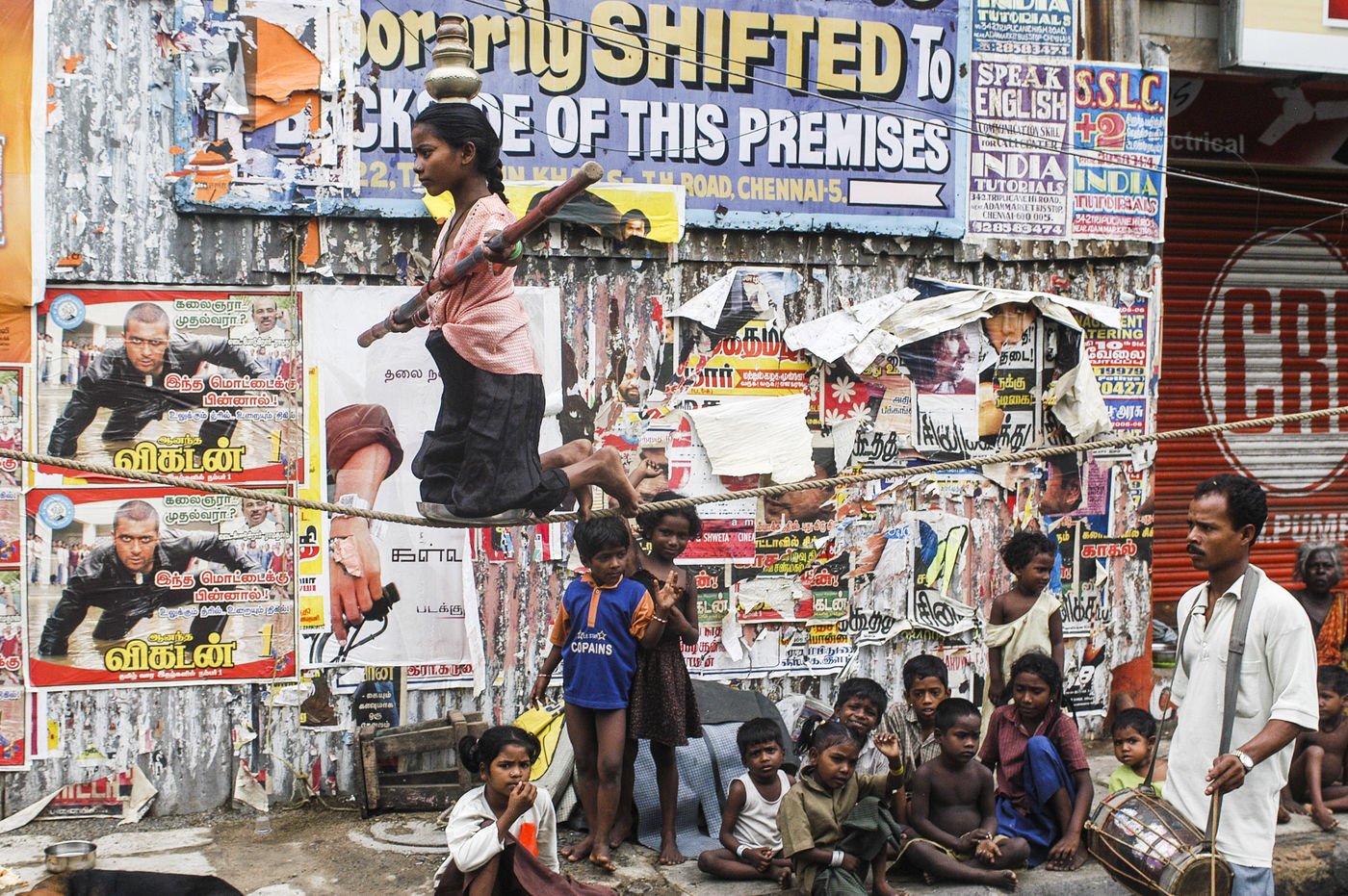 Streets of Chennai, India, a young girl performs acrobatics to earn some money.