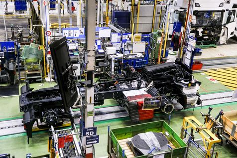 Illustrations of the SCANIA factory. Construction of trucks. The 300,000th vehicle left the factory in Angers. But on that day, production was stopped due to lack of parts or components. Like other industries, events such as the war in Ukraine but also this spring 2022 lockdown in China, block deliveries. The car parks are full of vehicles that are not quite finished.