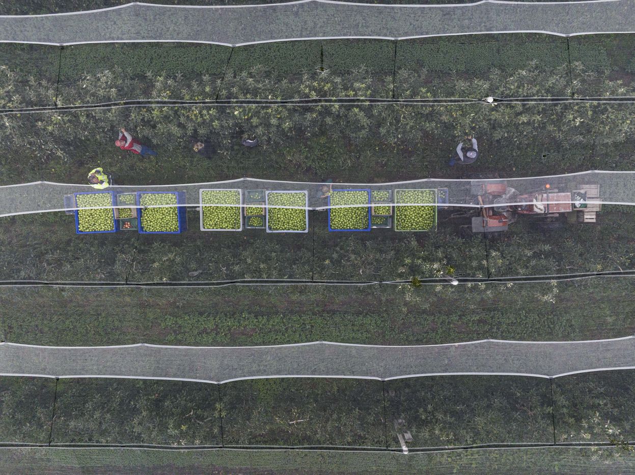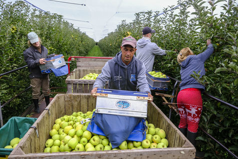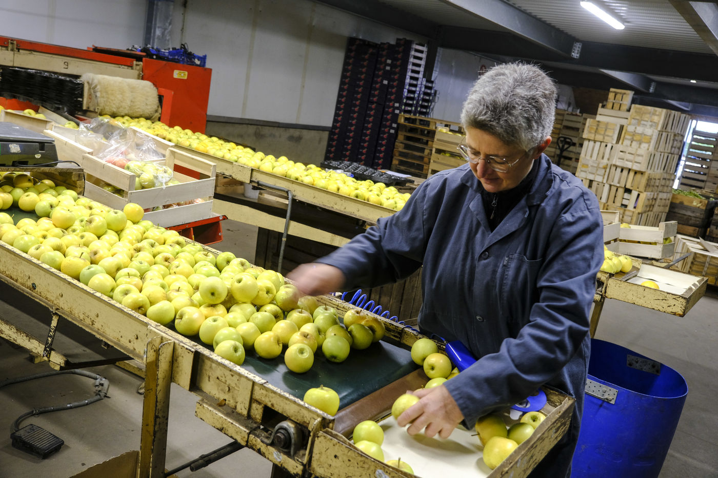 The apple harvest. In the orchards, the harvest is coming to an end. This year it started early. The pickers fill the paloxes which are then towed to the warehouse. The fruit is then washed, dried and graded (automatic grading machines). The bagging is done by hand.