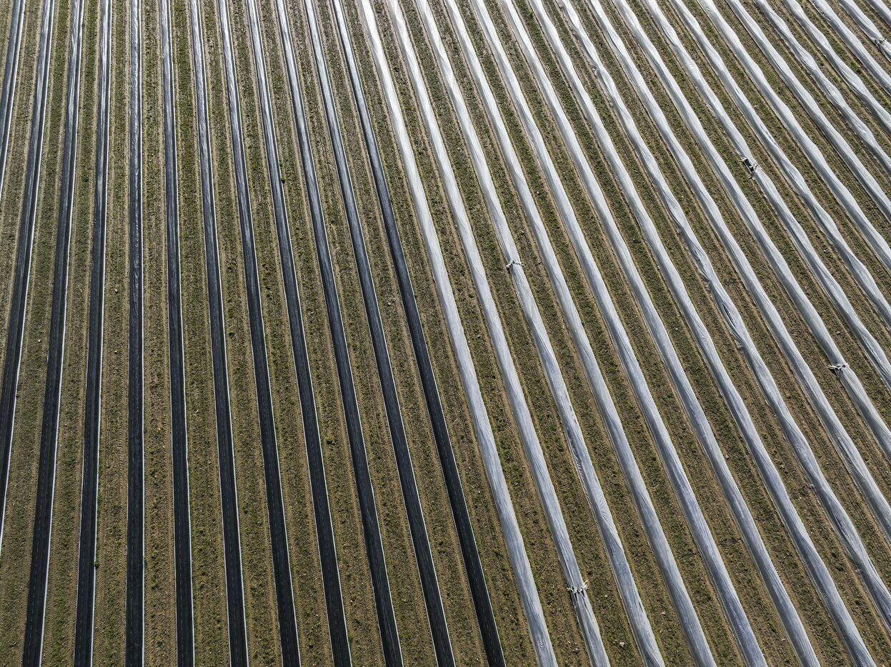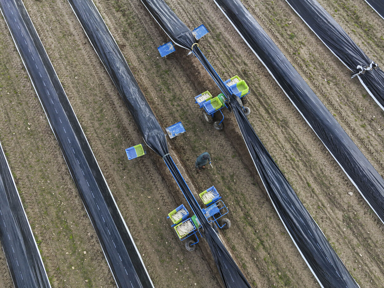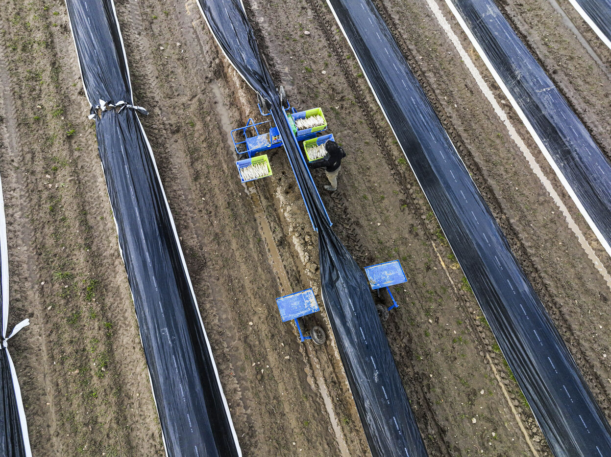 France, Bauge en Anjou, Maine et Loire, 2023-04-13. Asparagus production