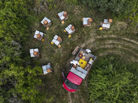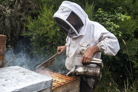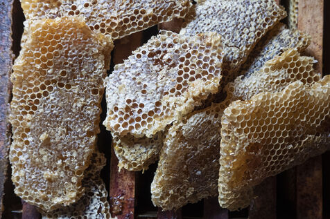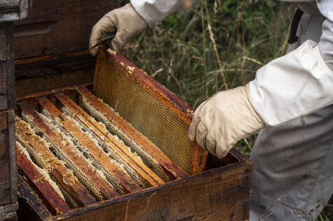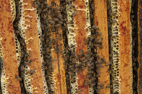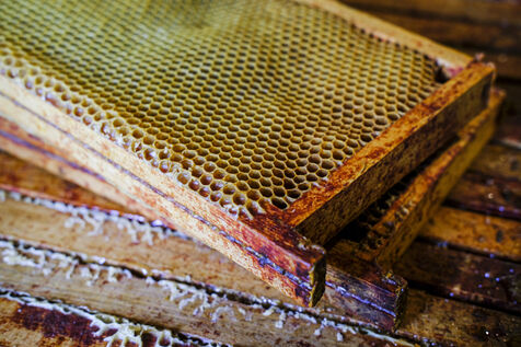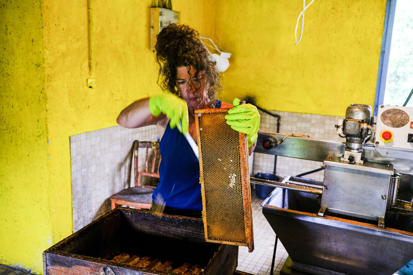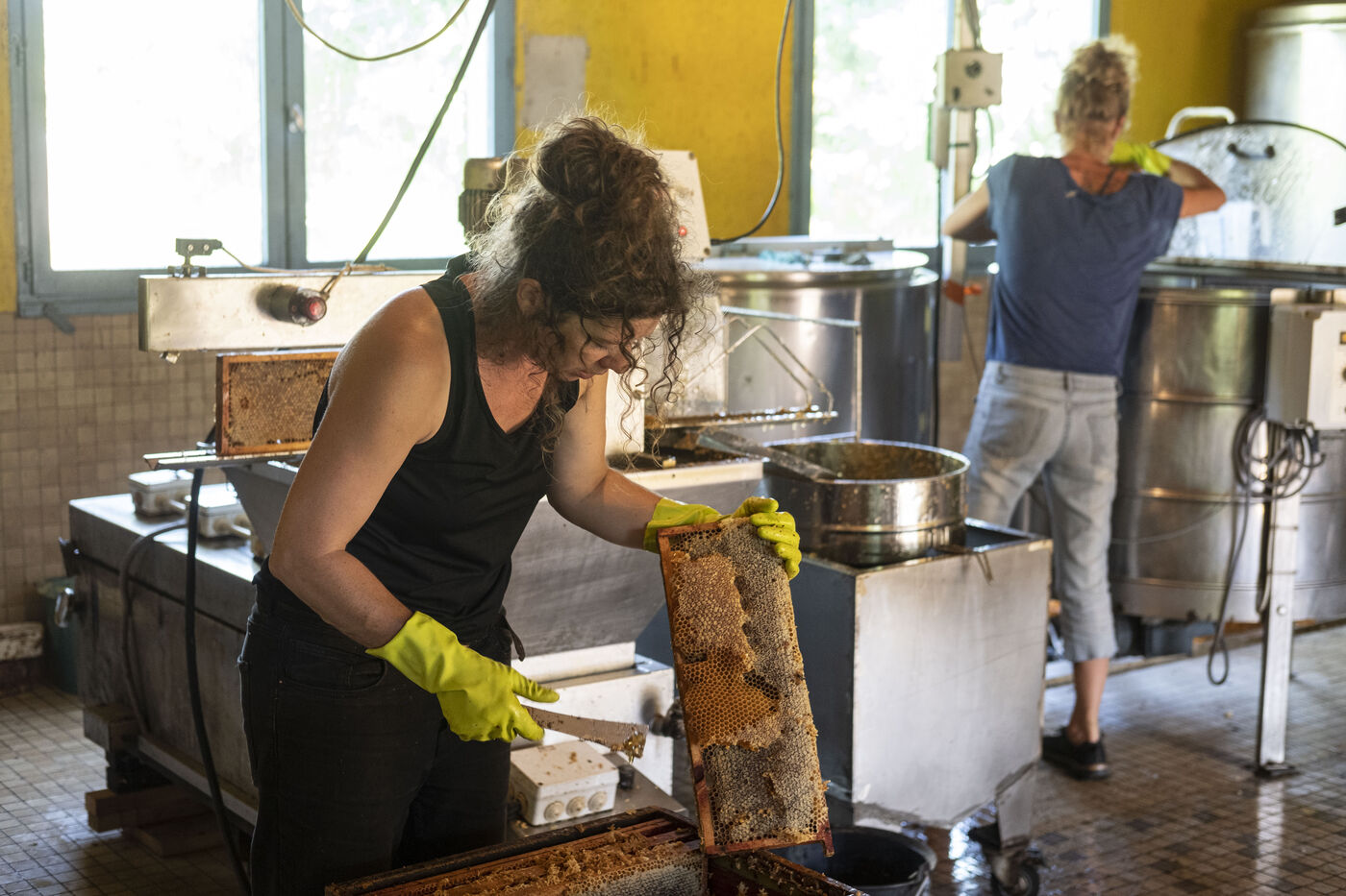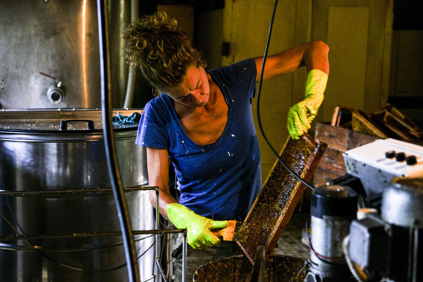 FRANCE. BAUGE EN ANJOU. 08/07/2023. Beekeepers harvesting the first honey from their hives. Then it has to be extracted from the crates. This is done by hand. The honey is then extracted by machine. The honey is stored in vats. Then, after a few weeks, it is put into jars.