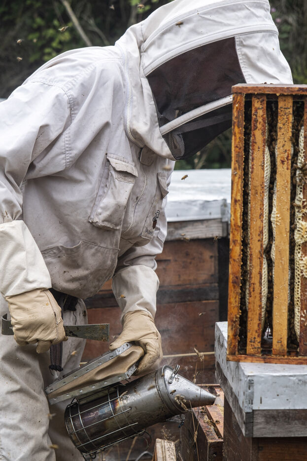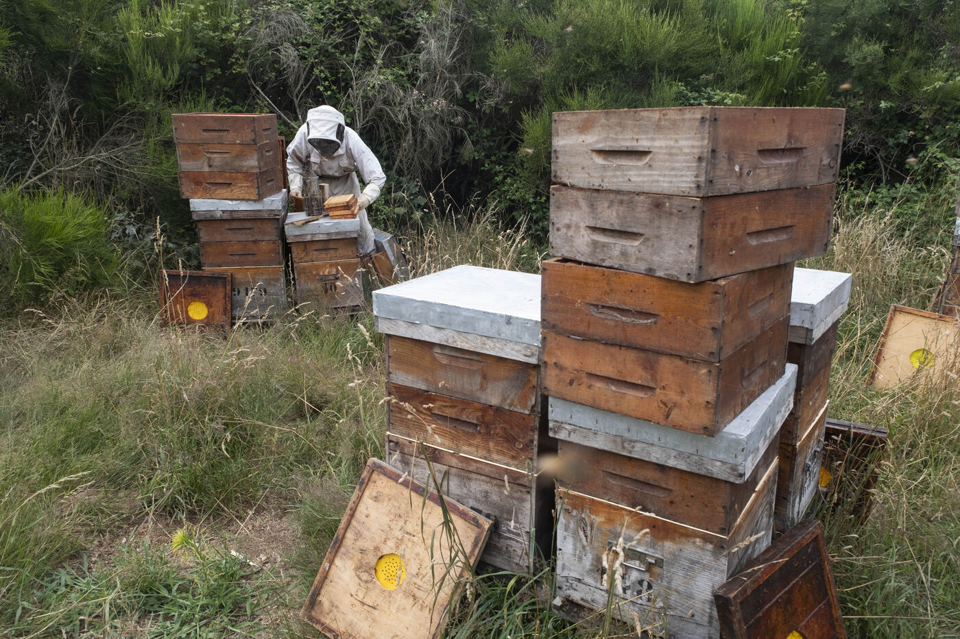 FRANCE. BAUGE EN ANJOU. 08/07/2023. Apiculteurs récoltant les premiers miels dans leurs ruches. Ensuite, il faut l'extraire des casiers. Travail manuel. Puis l'extraction se fait à l'aide d'une machine. Le miel sera stocké dans des cuves. Puis, après quelques semaines, il sera mis en pot.