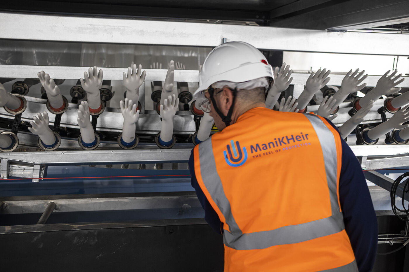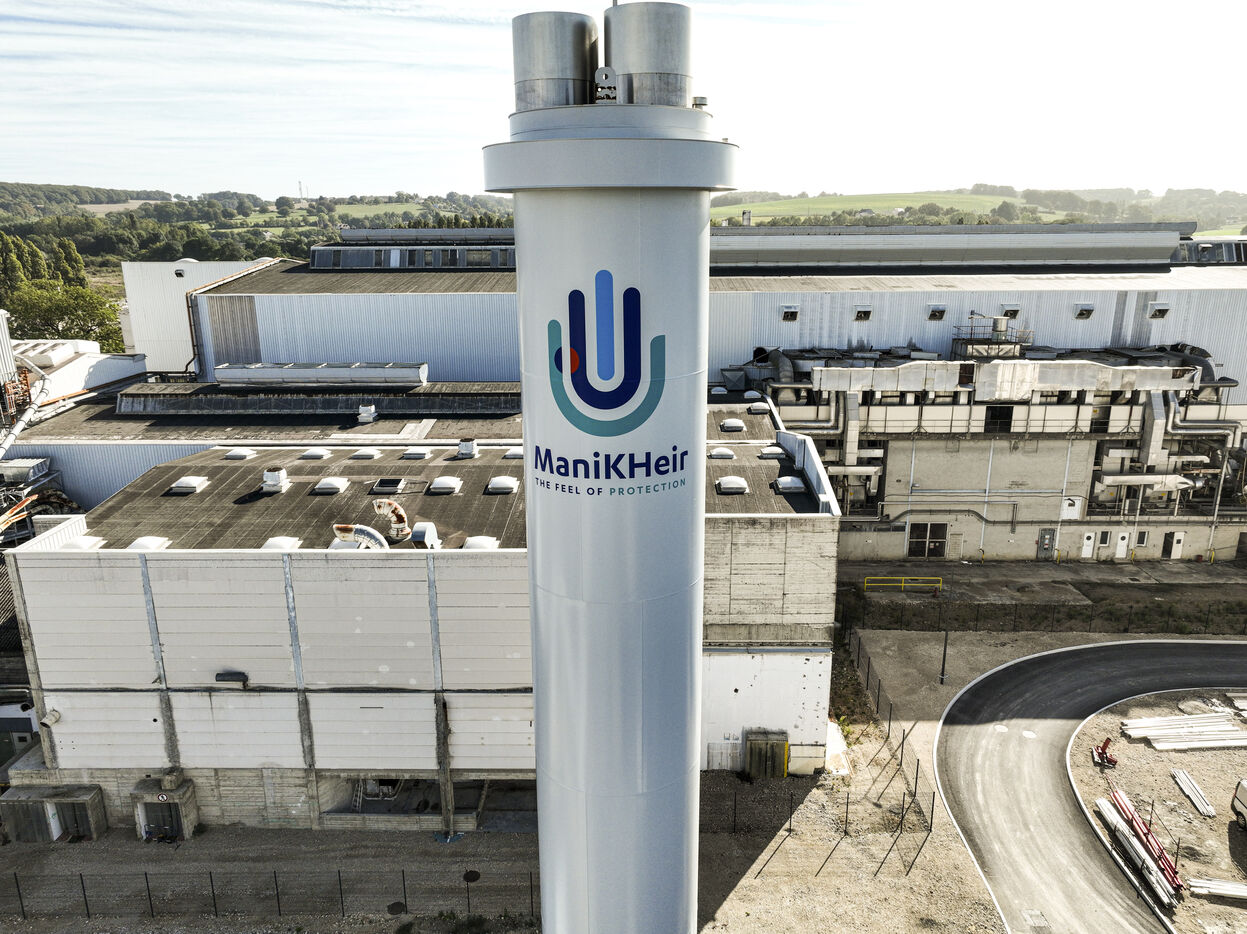 FRANCE. BESSE SUR BRAYE. SEPTEMBRE 2023. Apres deux annees d?un chantier titanesque, Le groupe Kolmi-Hopen, specialisee dans les dispositifs medicaux a usages uniques, a demarre la production de gants en nitrile. Cet equipement specifique aux milieux medicaux, dentaires et agroalimentaires etait jusque?a present uniquement produit en Asie. L?usine se trouve sur l?emplacement de l?ancienne papeterie Arjowiggins, a Besse sur Braye, dans la Sarthe. Photographie de Jean-Michel Delage / HANS LUCAS.