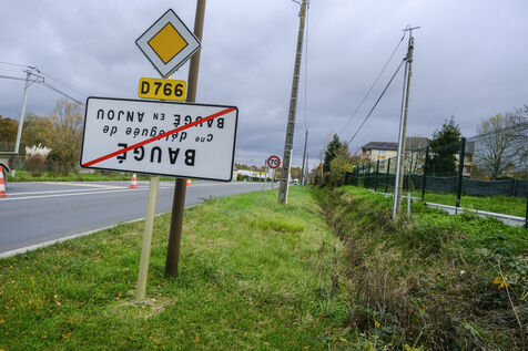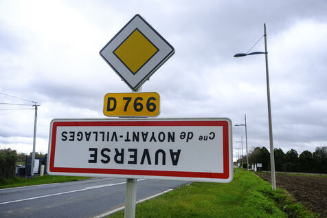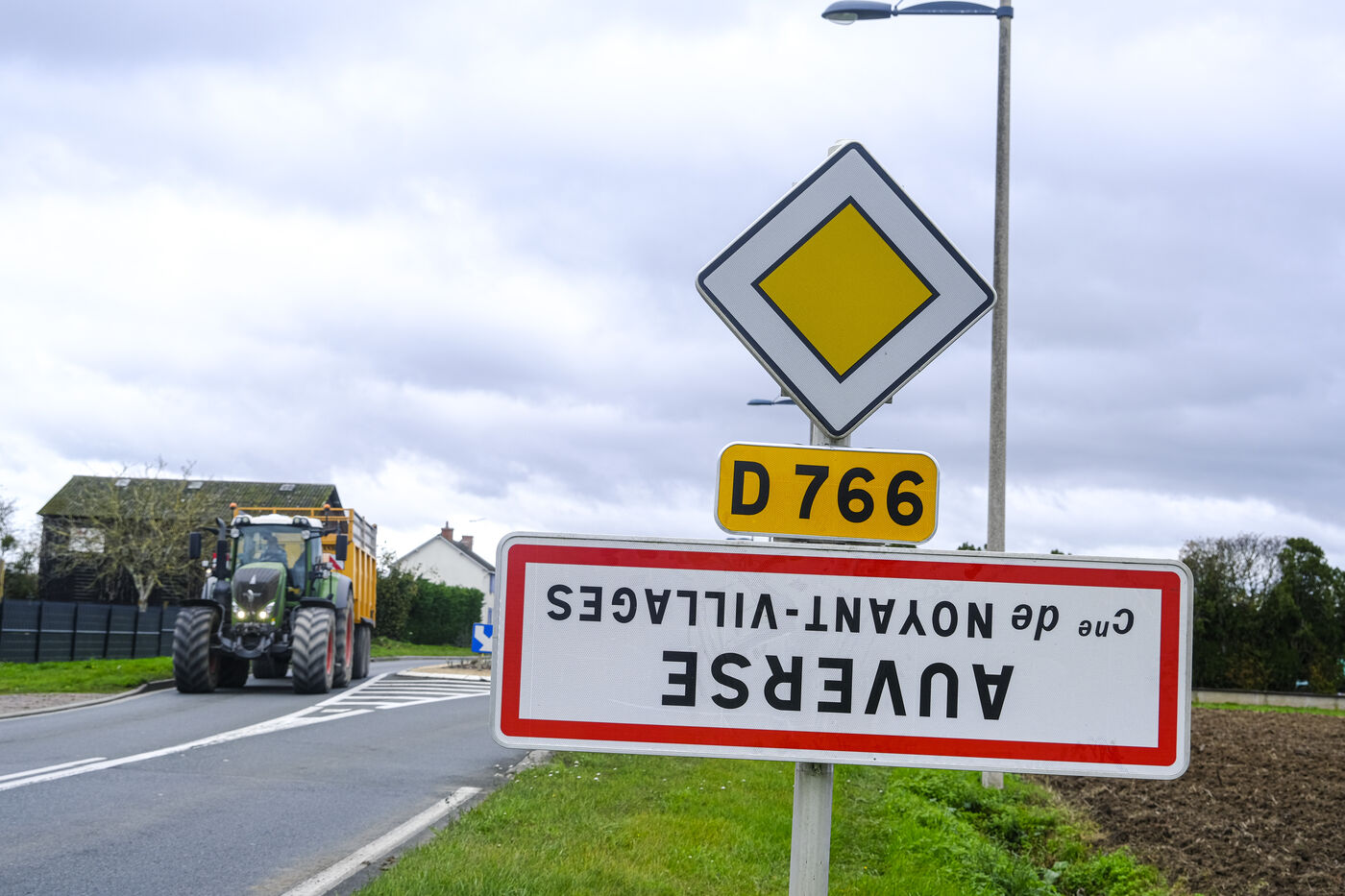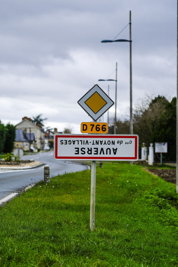 FRANCE, MAINE ET LOIRE. 21 November 2023. In the department of Maine et Loire, as in other departments across France, signs indicating the entrances and exits of villages have been turned upside down. The operation, called "On marche sur la tête" ("We're walking on our heads"), was launched by the Jeunes Agriculteurs ("Young Farmers") to highlight the inconsistencies in agricultural regulations. Photographer Jean-Michel Delage/Hans Lucas