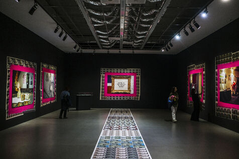 The exposition traces the creative path of global megastar, legendary British graffiti artist Banksy from street art to museum walls. Photographer: Jean-Michel DELAGE/Hans Lucas