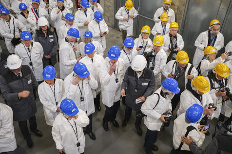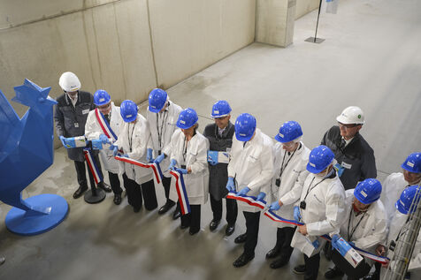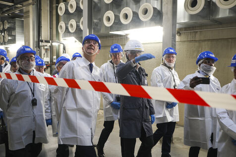 FRANCE, BESSÉ SUR BRAYE. 18/04/2024. Inauguration of the Manikheir factory. The French Minister for Industry, Roland Lescure, came to inaugurate the first nitrile glove factory. This industrial project, representing an investment of 88 million euros, is part of the reindustrialisation of the site of the former Arjowiggins paper mill, which is due to be wound up in 2019. Photographer: Jean-Michel DELAGE / Hans Lucas