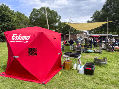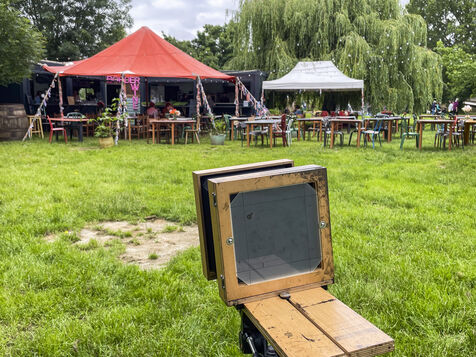 FRANCE, MAINE ET LOIRE. June 2024. Guinguettes are ephemeral establishments that usually open in spring and close in late autumn. Restaurants, bars. Each has its own specific characteristics. Here in the département, there are more than thirty of them. On the banks of the Loire, the Sarthe or the Authion, these are convivial places where you can meet up with friends or family. For this work, I use an old process. Wet collodion. I set up my lab under a tent. And I photograph on glass plates. With the vagaries of the process and the weather. So it's a work in progress. Photographer: Jean-Michel Delage / Hans Lucas