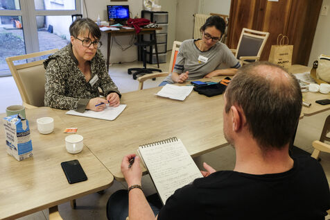 FRANCE, SAINT-MATHURIN SUR LOIRE. 04-07-2024. At the Bourg-Joly nursing home in Maine-et-Loire, the team working with the elderly asked Simon Bonnefoy, a comic strip artist from the Atelier Kawa art studio in Mazé-Milon, to create a comic strip. The idea is to change the way people look at old people's homes. How can we play down old age and change the image of these establishments? Volunteer residents and professionals will talk about what they experience and how they work. Photographer: Jean-Michel Delage/Hans Lucas