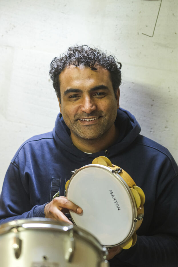 FRANCE, ANGERS. 11 mai 2025. Après avoir fui Gaza, cinq musiciens palestiniens et leurs familles sont accueillis, depuis le 9 janvier, par l'association Al Kamandjati, à Angers. Ces réfugiés bénéficieront d'une résidence d'artiste pendant un an grâce au programme PAUSE, un programme national d'accueil en urgence de scientifiques et d'artistes qui ne peuvent plus mener leurs travaux librement dans leurs pays d’origine, lancé en 2017 par Collège de France.