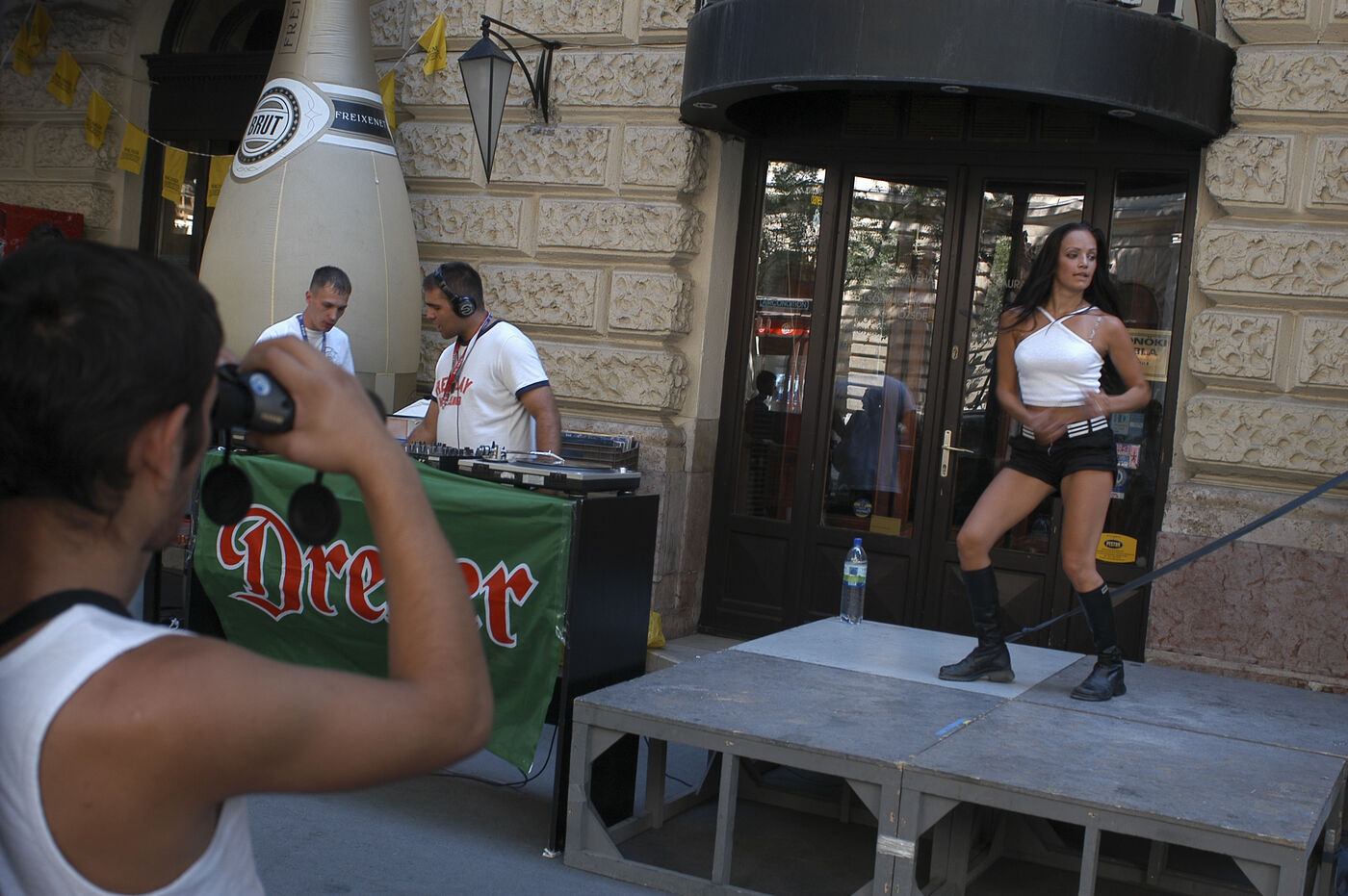 HONGRIE, BUDAPEST. 23 juin 2003. Love parade à Budapest. A cette époque, les hongrois vivaient encore dans une grand liberté post chute du mur. Cette grand parade rassemblait la jeunesse. La communauté LGBT pouvait sortir et les lois anti-homosexualité n’étaient pas d' actualité. Les rue de Budapest respiraient la liberté comme jamais. Photographe: Jean-Michel Delage