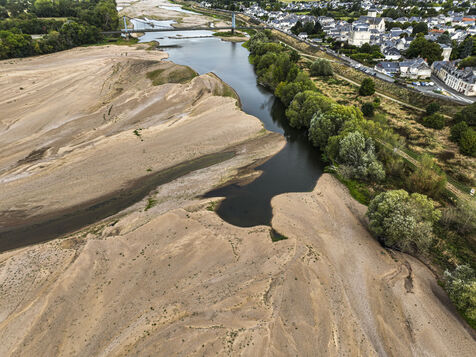 FRANCE, MAINE-ET-LOIRE. 1 September 2025. The Loire River in Maine-et-Loire. Some sections are now nothing more than sandbanks. A lack of water due to climate change is radically altering the river's appearance. Photographer: Jean-Michel DELAGE/Hans Lucas
