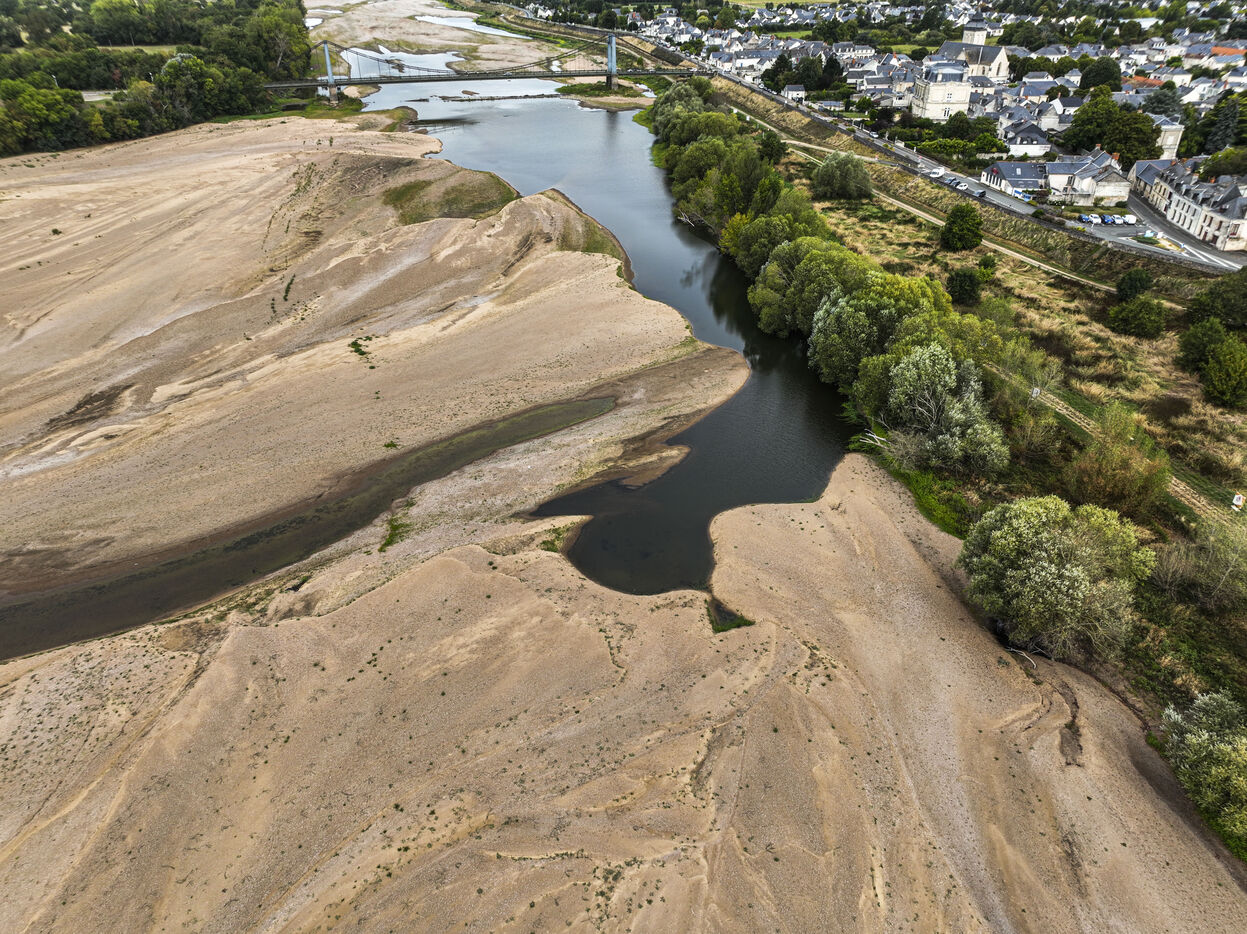 FRANCE, MAINE ET LOIRE. 01 septembre 2025. La Loire dans le Maine et Loire. Certaines portions ne sont plus que des bancs ce sable. Un manque d’eau dû au climat change radicalement la physionomie du fleuve. Photographe: Jean-Michel DELAGE/Hans Lucas