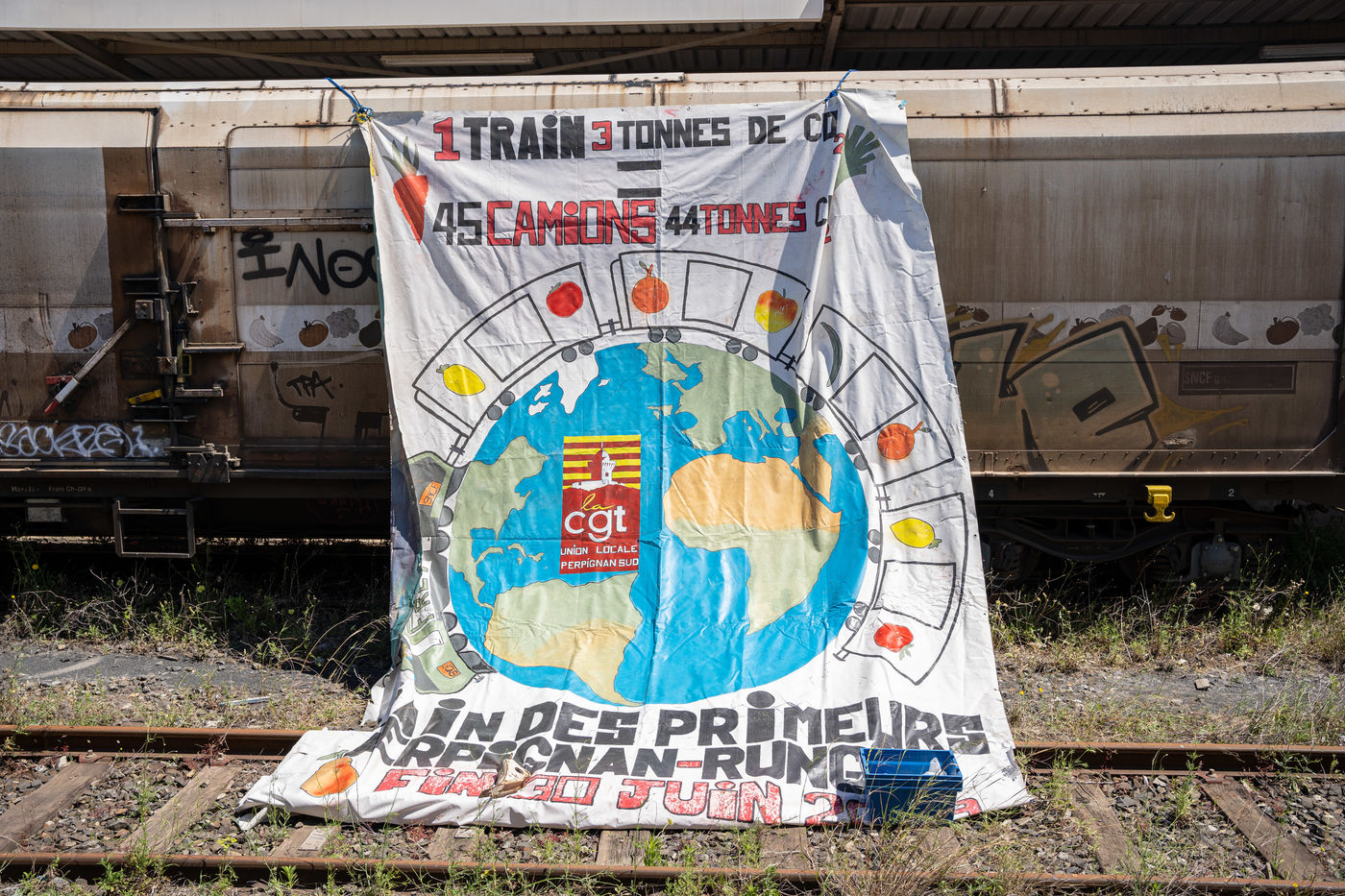 Ce 25 mai 2021, des membres de la CGT et cheminots étaient rassemblés sur un ancien quai de chargement ferroviaire à Perpignan pour demander le retour du Train des Primeurs. Ce train qui transportait des marchandises de Perpignan à Rungis a été stoppé en 2019 et n'est toujours pas rétabli malgré les déclarations du gouvernement. Les militants prônent le retour au transport ferroviaire de manière générale pour des raisons écologiques, économiques et sociales.